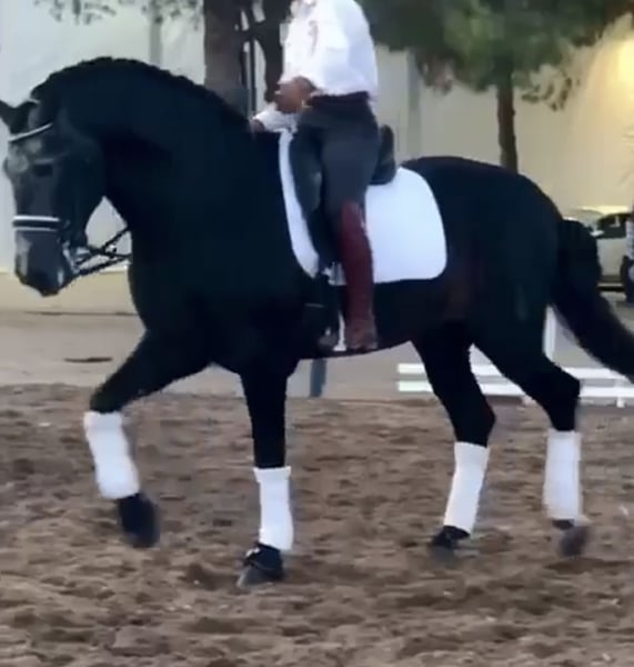 Eyecatching PRE stallion with a magnificent appearance and exceptional training in dressage and show jumping. Irup, born in 2020, holds full ANCCE papers as a PRE. He is currently working at an advanced level thanks to his excellent mindset and willingness to work. He is ridden and trained by a professional rider who is preparing him for higher levels. He has competition experience in functionality classes at ANCCE shows, as well as in morphology and spectacle events, with audiences of thousands. He is piroplasmosis-free and has up-to-date, clean X-rays.