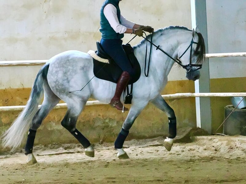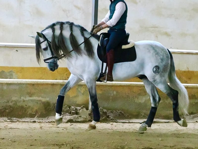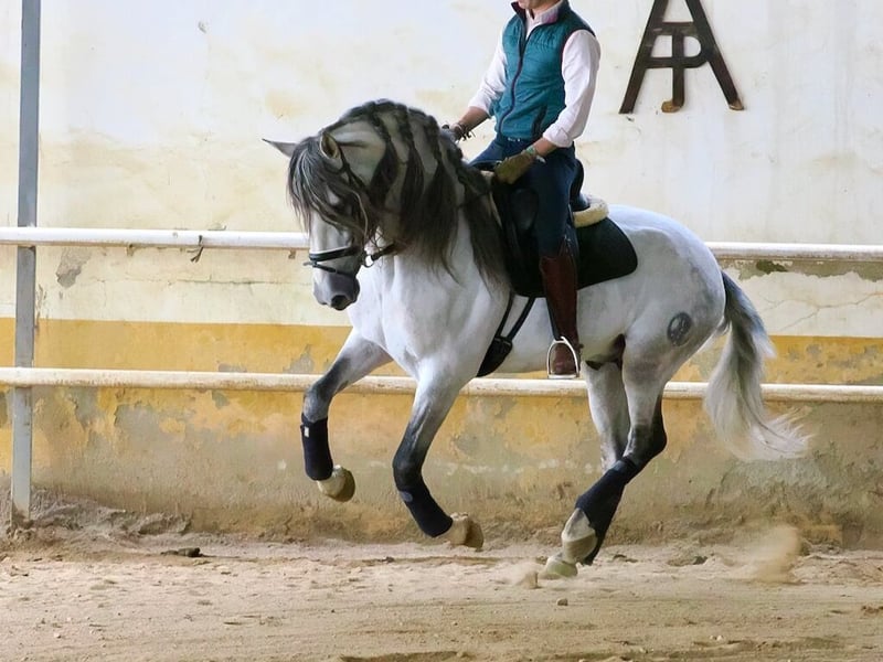Dieser prächtige Pura Raza Española (PRE) Hengst, geboren im Jahr 2019 und mit einer Widerristhöhe von etwa 160 cm, verkörpert die Eleganz, Funktionalität und den edlen Charakter, die für diese Rasse so typisch sind. Es handelt sich um einen Hengst, der in der Hohen Schule ausgebildet ist und ein hohes Maß an Vorbereitung sowie ein gutes Verständnis der klassischen Reitkunst zeigt. Besonders hervorzuheben sind sein Gleichgewicht, seine Kadenz und seine Ausdrucksstärke in jeder Bewegung. Unter dem Sattel zeigt er eine sehr positive Einstellung, große Lernbereitschaft und eine natürliche Verbindung zum Reiter. Aktuell führt er fortgeschrittene Lektionen der klassischen Dressur wie Piaffe, Passage und Spanischen Schritt sicher und qualitativ aus. Diese Lektionen erfordern ein hohes Maß an Versammlung, Kraft und Koordination. Seine Piaffe ist rhythmisch und ausdrucksstark mit guter Erhebung und Takt, während seine Passage durch ihre Schwebephase und Elastizität beeindruckt und ein Gefühl großer Leichtigkeit vermittelt. Der Spanische Schritt ist weit und elegant und verleiht seinem Repertoire der Hohen Schule einen besonders spektakulären Ausdruck. Neben seinen technischen Fähigkeiten überzeugt er auch durch seinen ausgeglichenen und edlen Charakter, der den täglichen Umgang sowie das Training sowohl auf dem Reitplatz als auch bei Präsentationen erleichtert. Seine harmonische Morphologie mit typischen PRE-Linien, einem ausdrucksstarken Kopf und einer kompakten, funktionalen Struktur macht ihn zu einem sehr attraktiven Pferd sowohl für den sportlichen Einsatz als auch für klassische Dressurvorführungen oder Reitshows. Insgesamt handelt es sich um ein Pferd mit Präsenz, Talent und einem fortgeschrittenen Ausbildungsstand, ideal für Liebhaber der Hohen Schule oder für Reiter, die ein gut ausgebildetes Pferd suchen, um die klassische Reitkunst mit Qualität und Stil zu genießen.