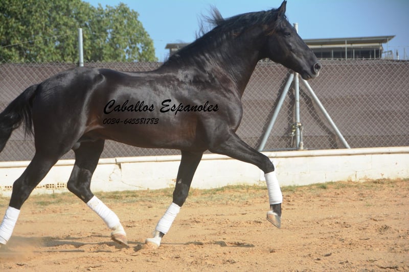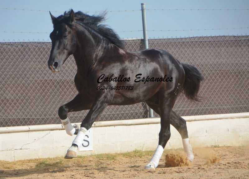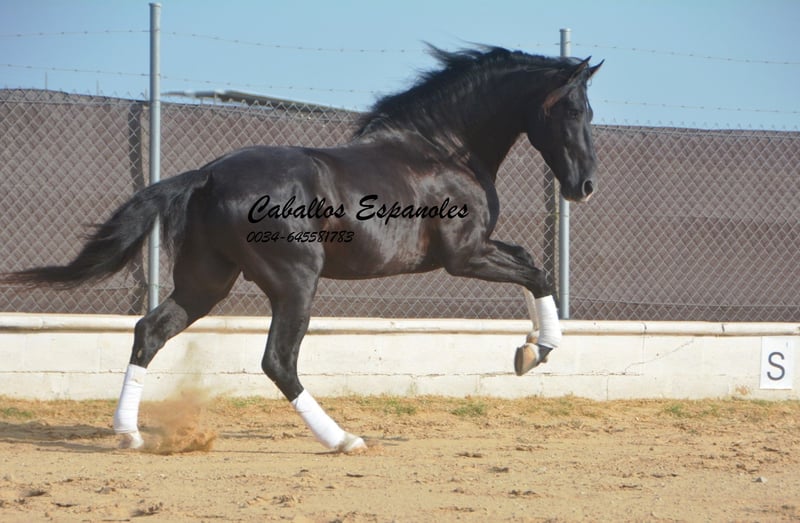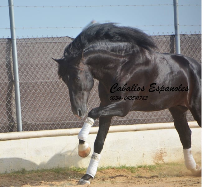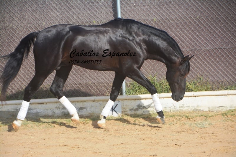 Magnifique étalon PRE bai, construit de manière correcte avec une apparence baroque. L'étalon est très bien dressé, il marche calmement à côté des juments. Le bai est solide dans ses allures de base, avec des passages latéraux et un pas espagnol. Il travaille actuellement sur la piaffer et les changements de galop. Ascendance : Boloix, Bocado Le cheval est vendu pour le compte du propriétaire. Il peut rester en pension chez nous si souhaité. Une échographie complète sera organisée rapidement. Transport international possible.