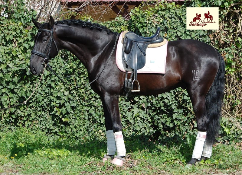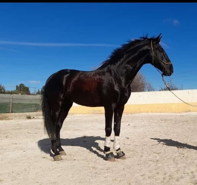 6 years old black PRE Stallion in sport type. In proffesional training according to his age. Walk piruets, shoulder in, counter canter, canter half pass, simple changes. Initiated in piaffe and passage. Already with competition experience in 5 years old's class (with results 68%-69%). Brothers also compeeting successfully. Excellent dressage prospect. Licensed stallion, alredy with sons registered. Great character. From Piroplasmosis free zone.