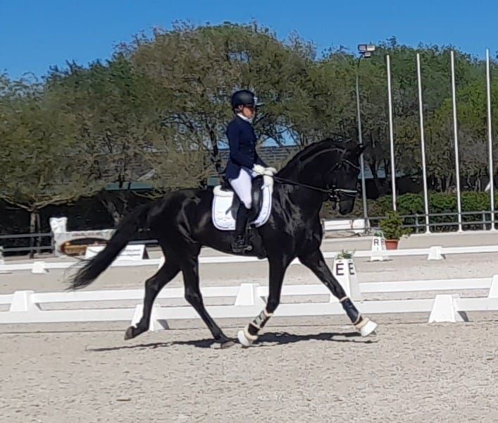 6 jaar oude zwarte PRE hengst in sport type. Getraind volgens zijn leeftijd. Piruets in stap, contragalop, galop halve pas, eenvoudige wissels etc. En al wedstrijdervaring in de 6-jarigen klasse (met resultaten 68%-69%) Broers ook op concours. Uitstekende dressuurvooruitzichten. Heeft basis hengstenkeuring voor de fokkerij.