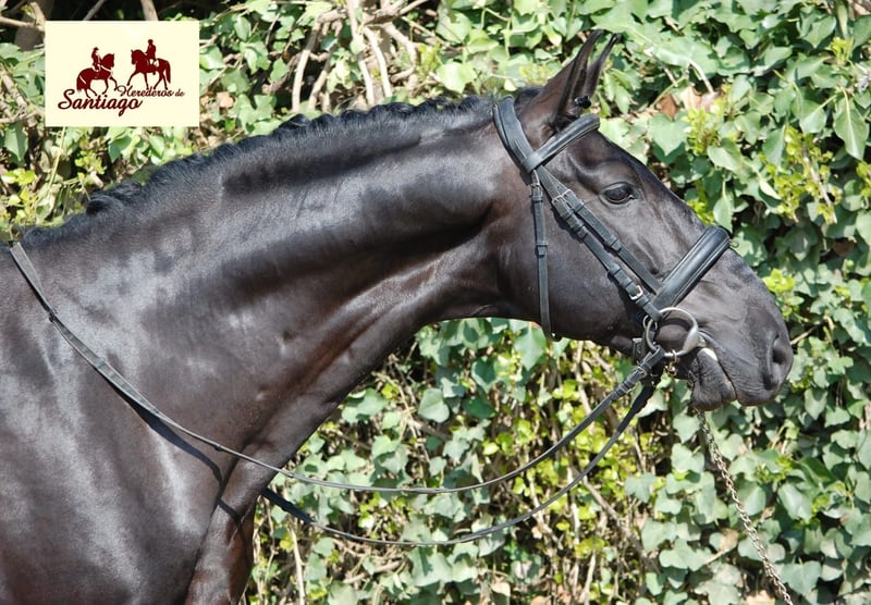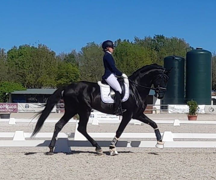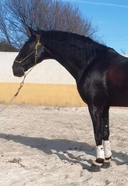 Stallone PRE nero di 6 anni di tipo sportivo. Addestrato secondo la sua età. Pirouette al passo, contro galoppo, passaggi laterali al galoppo, cambi semplici, ecc. E già con esperienza di competizione nella categoria dei 6 anni (con risultati del 68%-69%). Fratelli che competono anch'essi. Eccellente prospettiva per il dressage. Ha l'approvazione di base per la riproduzione.