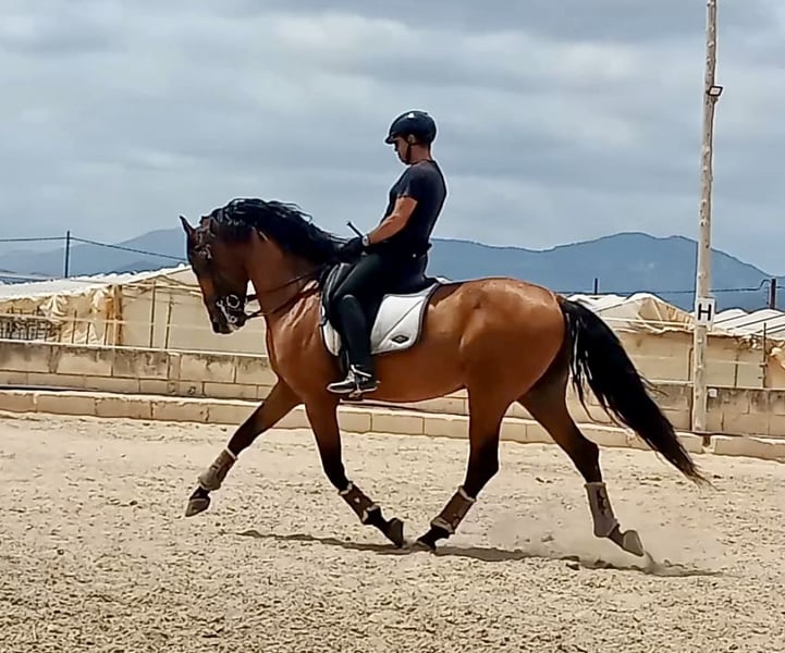 Caballo castaño limpio nieto del semental élite Educado con movimientos, morfología y un carácter extraordinario. Nada de caliente, esta concentrado en su trabajo y esta domado por un jinete profesional. Siempre era muy bien cuidado. El nivel de doma es de 3 con éxito. Preparado para salir en nivel 4