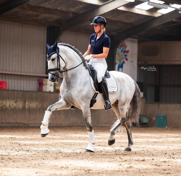Elias Torreluna es un hermoso semental tordo con un carácter de oro. Elias es un caballo que te roba el corazón de inmediato con sus abrazos, su hermosa melena larga y su precioso brillo plateado. Tiene 3 aires muy buenos. Posee un buen paso, un trote amplio con muy buen posterior y un galope ascendente que es fácil de cerrar, es muy agradable de montar y realmente te da una sensación de asombro. Elias es un caballo adecuado tanto para un jinete ambicioso como para un jinete principiante. Elias está clasificado en ZZ Licht y se entrena a nivel ZZ Zwaar, tiene mucho potencial para passage y piaffe. Amazona mide 1.78. NL Stables Elias Torreluna ha logrado muchos resultados hermosos a una edad temprana. Durante el Campeonato Holandés MCI de Caballos Jóvenes 2023 fue subcampeón con una puntuación promedio del 86%. Este semental PRE también tuvo un buen desempeño durante el Campeonato Europeo en París, ganó la primera prueba en la categoría de caballos jóvenes y obtuvo una medalla de bronce en la clasificación general de esta categoría. En el proceso de selección para el Campeonato Europeo MCI 2024, Elias se convirtió en campeón holandés con una puntuación del 73% en la prueba y 77% en la kür nivel 2. Con esto, se califica nuevamente para el Campeonato Europeo MCI 2024 en Exloo. Aquí obtuvo el título de subcampeón europeo en Sevilla y ganó por segunda vez consecutiva, además de la plata individual, el oro por equipos. Además de sus logros en la pista con el MCI, Elias también tiene buenos resultados en las competiciones de la KNHS. Ha conseguido múltiples victorias entre los caballos de sangre caliente en Z1 con puntuaciones alrededor del 68% y en Z2 con puntuaciones alrededor del 67%. Elias quedó cuarto en el Z2 durante los campeonatos de interior de la KNHS 2025. Elias proviene directamente del criador Yeguada Torreluna, completamente aprobado incluyendo cuello y espalda.