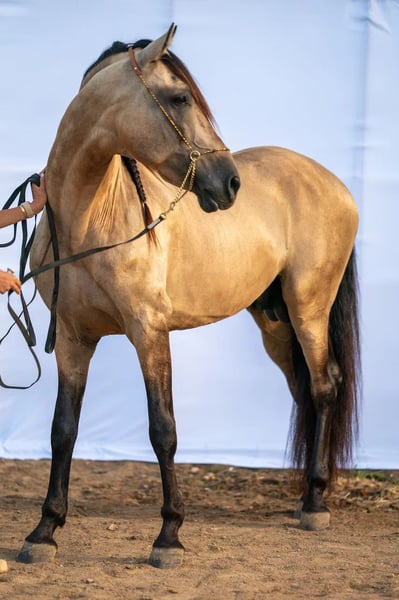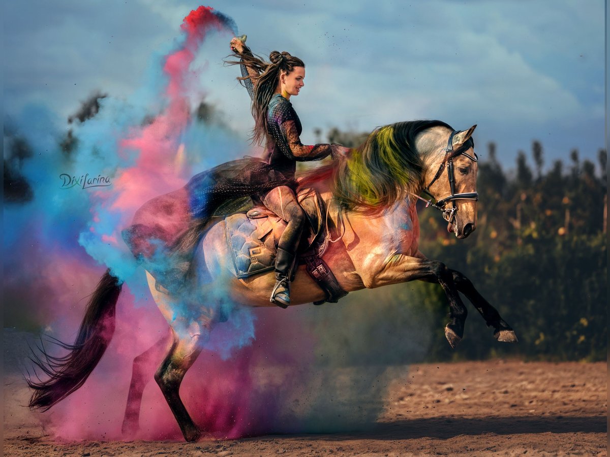 Promesa , PRE bayo 2017 con sangre Paco Martí. Caballo muy noble y seguro, perfecto para jinete principiante. Bajo la silla: paso, trote, galope, cambio de pie, piaffe, passage, paso español. En la cuerda trabaja adelante-abajo sin tensión. Comportamiento ejemplar: no se sementalea, fácil en el manejo. Sale al campo sin embocadura, siempre tranquilo y confiado. Un PRE funcional, bonito y muy bien enseñado listo para disfrutar desde el primer día.