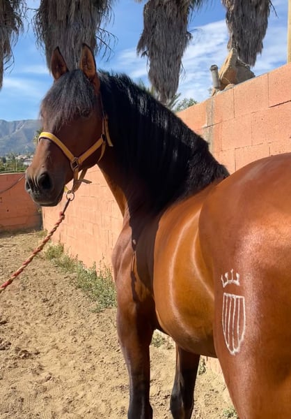 For sale: beautiful PRE horse! We present our purebred Spanish stallion, born in 2016. This magnificent specimen has a beautiful chestnut coat and an impressive height of 168 cm. Ideal for leisure, he is perfect for those seeking a noble and elegant companion. His temperament is balanced and friendly, making him an excellent choice for both experienced riders and those who are just starting in the equestrian world. Don't miss the opportunity to meet this exceptional horse. Contact us for more information and to schedule a visit!