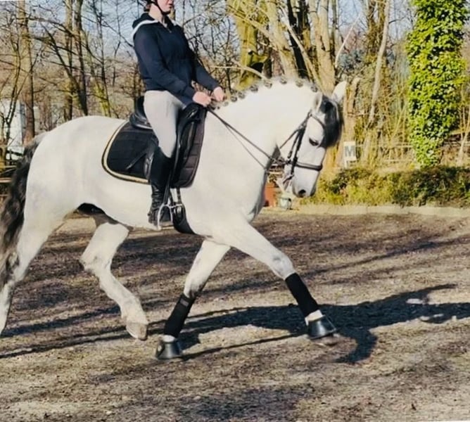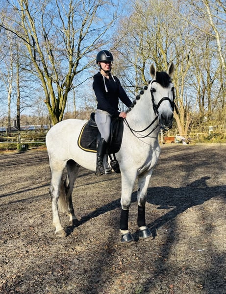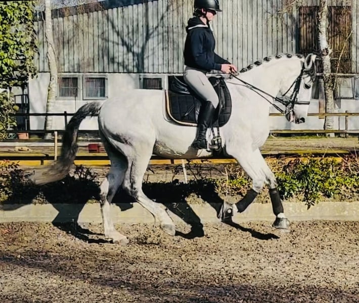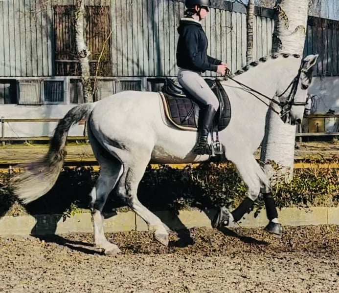 This large-framed grey gelding is well-trained and offers a comfortable seat. He performs lateral movements and extended canter with ease. He is reliable in handling and has a steady character. For further questions, please call 01722420434. Visit BarockmeetsClassic.de