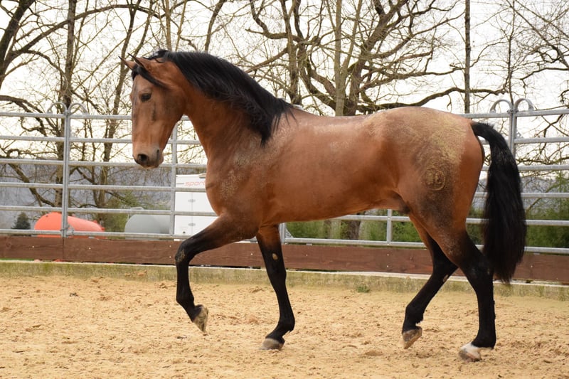 Dolar JC is 9 years old and stands at 1.63m. His IGG was evaluated at 107% during conformation competitions in Spain. His mother comes from the famous Peralta breeding! Beyond his origins, Dolar shows true ease under saddle. Very well trained, he masters the airs of the high school: two-time changes, passage, piaffe, Spanish walk, and the approach to the pirouette. He is a sensitive and endearing horse, generous under saddle and curious about interaction. The ideal sport partner for a rider looking to advance their dressage while developing an exclusive relationship with this horse, as fine and refined as he is expressive. His radiographic report is perfect and available upon request. Like all horses joining Alegria, Dolar is educated according to the Complicity Relationship® curriculum, our educational method that guarantees you safety and peace of mind. It is possible to reserve him now and continue his development with our support at the stud or through our online training. Price upon request, variable depending on the horse's education.