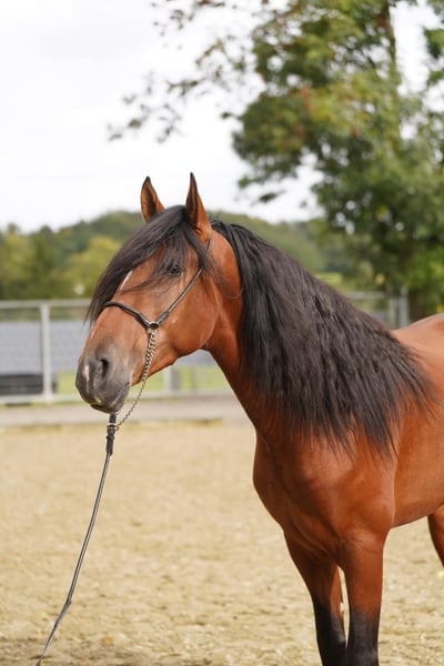 The beautiful and absolutely cool gelding, currently measuring 167 cm, is at the beginning of his career. He is being gently accustomed to the rider's weight. Due to his age, he is currently trained 3-4 times a week. This includes groundwork, treadmill training, and lunging with a saddle. Once a month, loading practice is conducted with all the horses. He has been regularly dewormed and has seen the dentist and physiotherapist. He also has current X-rays. The presentation of the horse will be charged at €30.