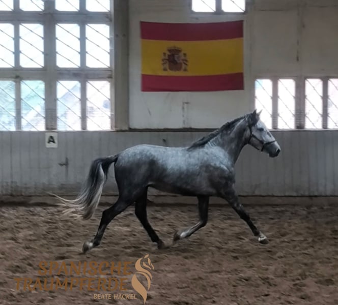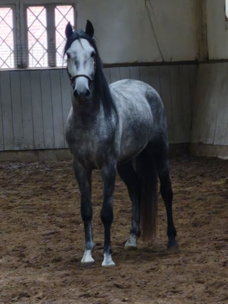 Uroczy konik w kompaktowym rozmiarze – to nasz ✨SALOMON SH✨. Na początku nieco nieśmiały, ten piękny ogier PRE teraz pokazuje swoją dowcipną i bardzo przyjazną dla człowieka stronę. SALOMON SH nadal rozwija się fizycznie i ma jeszcze czas, aby spokojnie wzrastać w swoim ciele. Mimo to, prezentuje piękny zakres ruchu, jest pracowity i niezwykle łagodny podczas pracy, chętnie się uczy i chce zrobić wszystko dobrze dla swojego opiekuna. W wieku odpowiednim dla początkującego jeźdźca, na początku swojej edukacji jeździeckiej, głównie rozwijamy tego pięknego ogiera PRE poprzez pracę na ziemi i z uzdą. Zna już siodło i ciężar jeźdźca, a pod jeźdźcem zachowuje się wzorowo. Zdjęcia rentgenowskie są dostępne. Lokalizacja: Traventhal, 23795