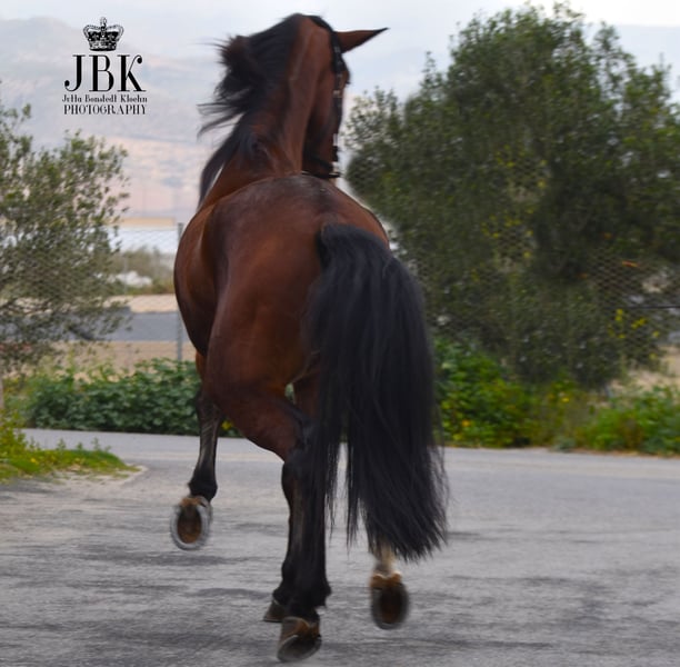 This excellent, large PRE stallion is sure to bring his future owner a great deal of joy. Character-wise, he is a real gem, and I would like to especially highlight his exceptional intelligence. He learns very quickly and has an excellent grasp of new concepts. Jecomias was gelded in autumn 2023. His basic training is currently in progress. He confidently performs all fundamental gaits with his rider on both hands. Additionally, Jecomias has daily turnout in a large paddock, allowing him to freely express his natural movement and energy. He gets along very well with other horses. Due to his current size, he will need some more time before he transforms from his somewhat lanky appearance into a more refined, mature look. However, as an adult horse, he will be truly magnificent.