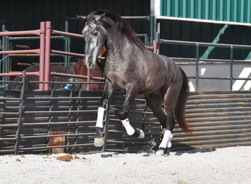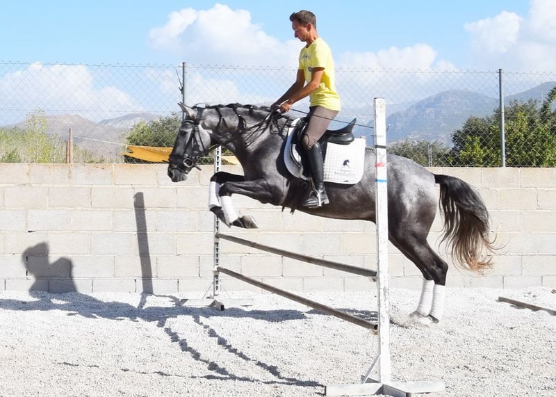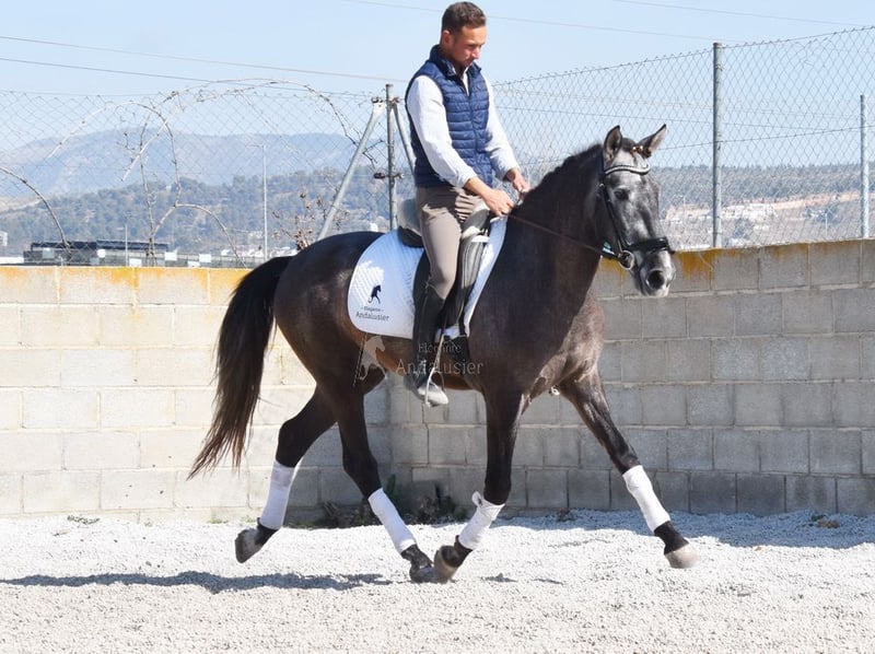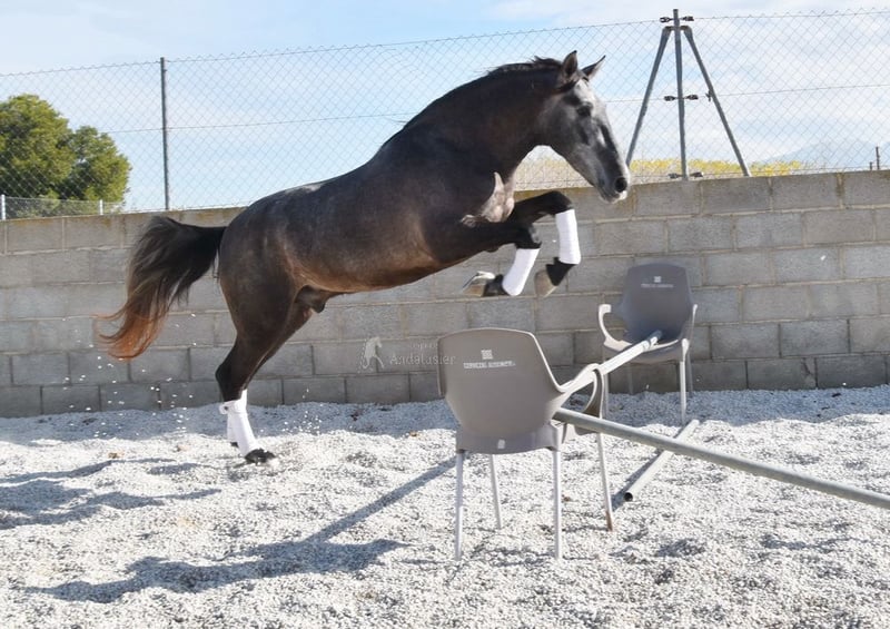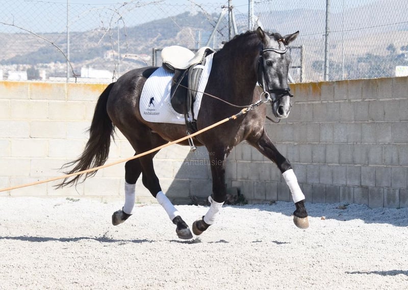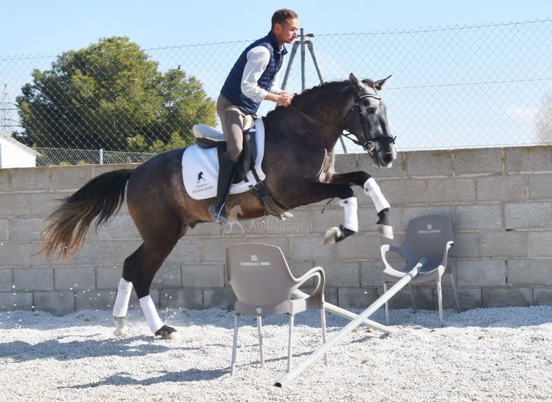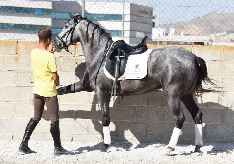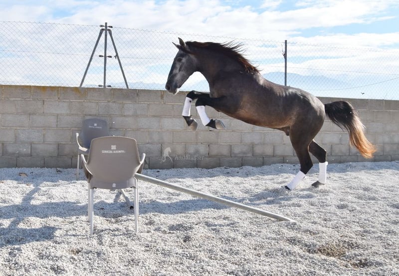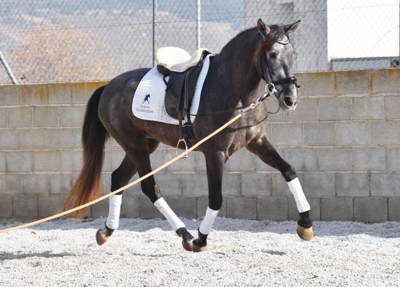 lieber Charakter, in den Grundgangarten geritten und Gelände, springt, etwas Spanischer Schritt und Piaffe, hat bereits Röntgen und ist Piroplasmose negativ, Abstammung: Yeguada Sierra Morena, Jose Enrique Muños de Albelda www.elegante-andalusier.com