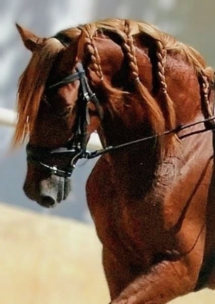 Tango......an incredibly beautiful and young PRE gelding in special color (chestnut) is looking for his FOREVER HOME. He is currently 1.60m tall but is expected to grow a few more centimeters, with a final height of about 1.63m anticipated. This stunning boy impresses with his amazing movement, expansive and elastic gaits, and a particularly loving and people-oriented character. He comes from an excellent private breeding and thus has very good social behavior. At 4 years old, he is well trained in all three gaits with a water snaffle. Of course, he still needs age-appropriate support to improve his balance. He is mostly worked in a relaxed manner in the field and is already very confident there, whether alone or in company. If you like this young, beautiful gentleman, please contact me with your phone number so I can get in touch with you as soon as possible.