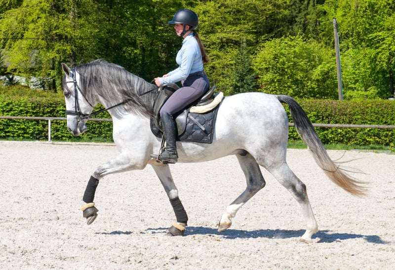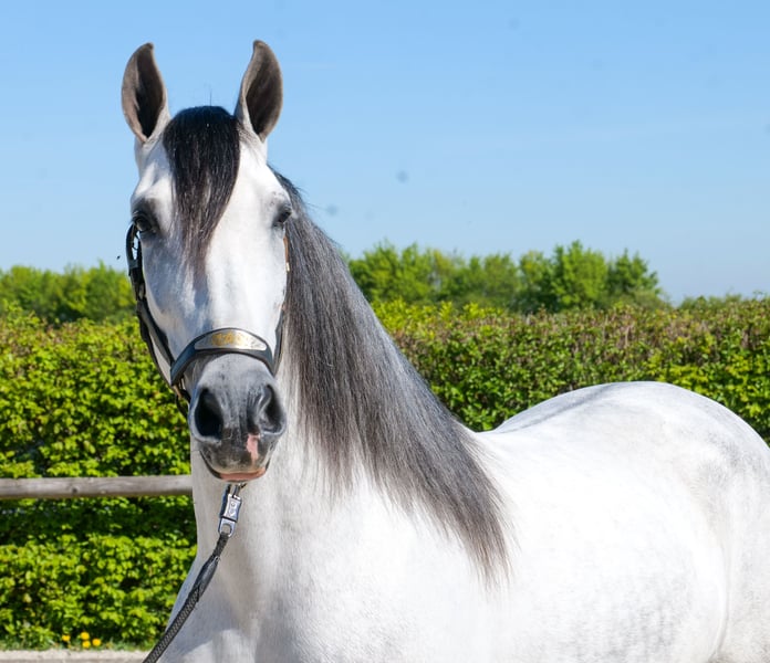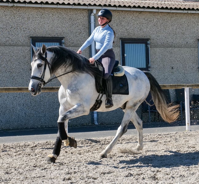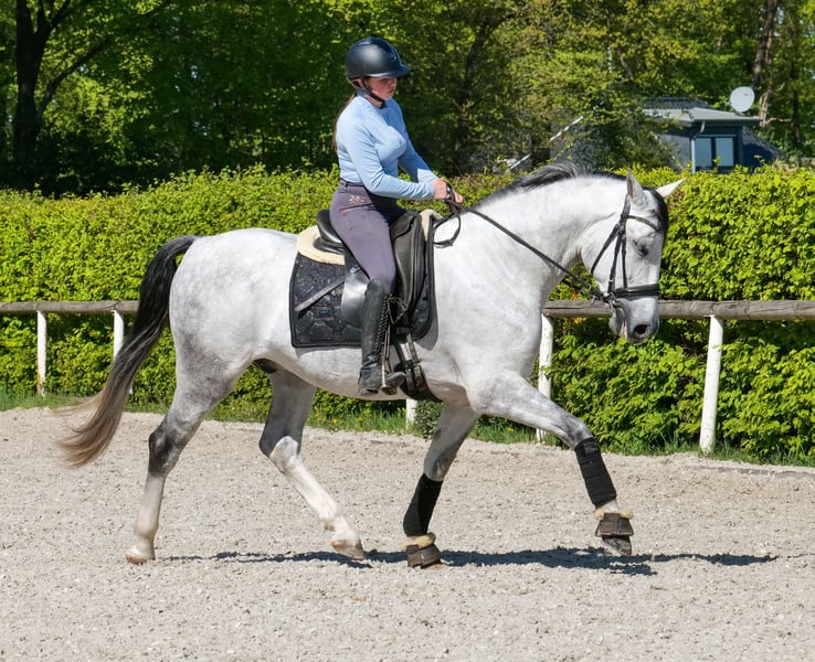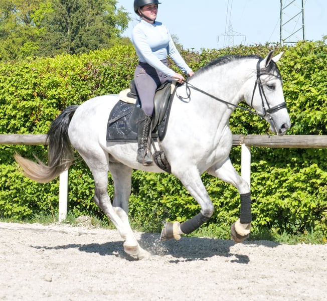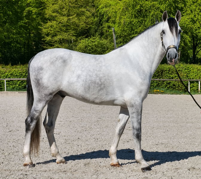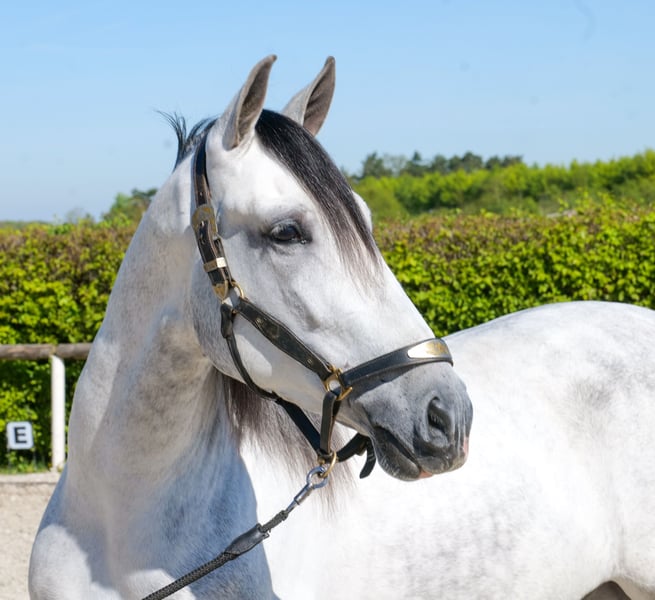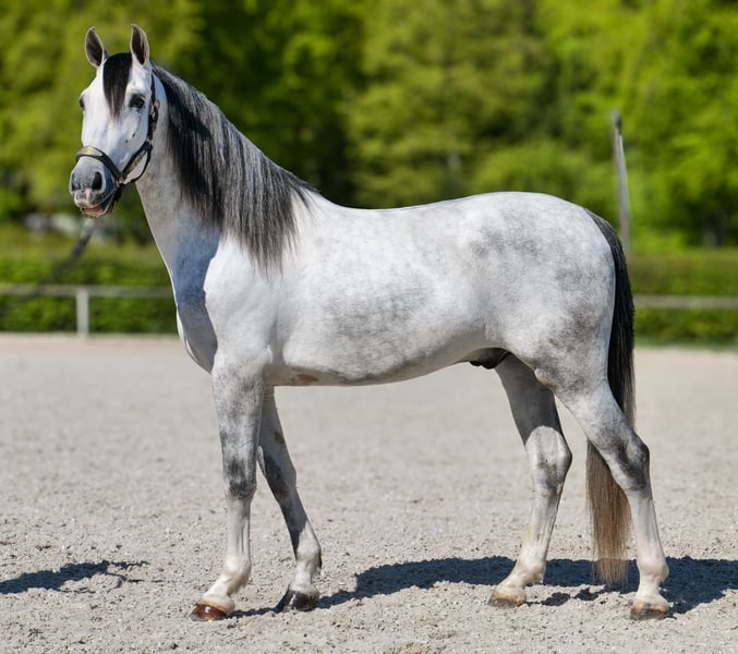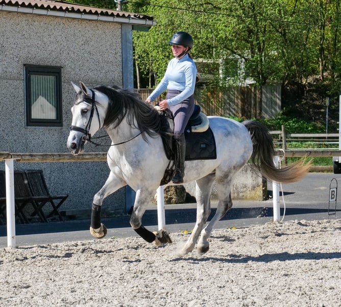 Name: Esplendido De Godoy Breed: Purebred Andalusian (P.R.E.) Gender: Gelding Date of Birth: April 28, 2021 Age: 5 years Height: 1.60 m (approx. 16.1 hh) Color: Grey (white) Pedigree: with pedigree Temperament: people-oriented, eager to learn, reliable, curious, intelligent, brave, calm Training/Suitability: ridden, dressage, leisure riding, baroque riding, working equitation, suitable for children, suitable as school horse Experience in terrain: dependable, fearless, resilient, confident both alone and in a group Health: dewormed, vaccinated, barefoot, eczema-free, teeth checked, osteopathically treated Stabling: box stall, paddock Special features: good basic gaits, very comfortable rider, farrier and loading friendly, herd-compatible Please note: The listed characteristics are based on our personal assessment and do not constitute a contractual guarantee. Price: €9,900 (gross price) Have we piqued your interest? To give you a better impression of Esplendido, we are happy to send you a riding video. Of course, we are available for a detailed description of the horse, personal consultation, and to answer all your questions via phone. Feel free to contact us anytime via WhatsApp or call us at: +49 151 19487595 Our phone hours are daily from 7:00 to 13:30 and again from 20:00. We look forward to hearing from you! A veterinary pre-purchase examination, including clinical and radiological assessments, can be arranged with your veterinarian. Esplendido can be safely and comfortably delivered to his new home. We take care of all preparations and transportation so that your new horse arrives stress-free, well cared for, insured, and in good health. Currently, we offer a carefully selected range of horses for sale. With us, you are guaranteed to find your dream horse. Feel free to visit us on our homepage: www.marvinsroyalhorses.de. Dear customers, we are happy to introduce you to our horses and offer grooming, tacking up, lunging, ground work, and trial riding in the riding hall, on the arena, or in the terrain to get to know your new family member better. This costs €40 per horse, with each additional horse €30, and will be refunded upon purchase. Our address: Ferdinand Grube 50 53577 Neustadt-Wied Google Maps: marvinsroyalhorses