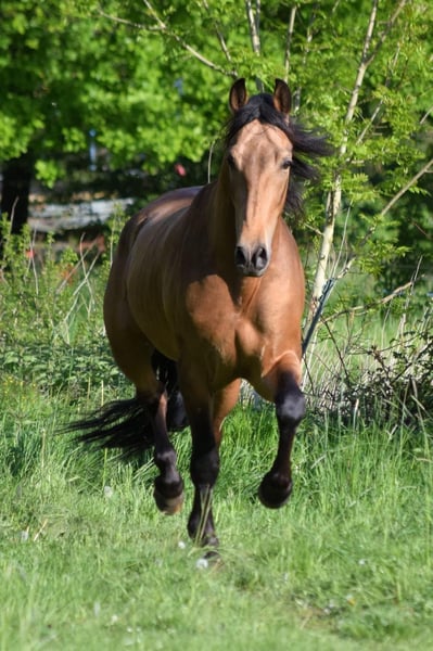 Stunning PRE gelding, born February 2021, in the rare color Buckskin/Falbe. He is very baroque in build, extremely compact, and has a correct conformation. In summer, his coat shines with a beautiful golden hue – truly eye-catching. With an approximate height of 16.1 hh, he provides excellent coverage for his rider and impresses with his striking appearance. The gelding is regularly dewormed and vaccinated and is accustomed to box and paddock turnout. Character-wise, he is an absolute treasure: friendly, affectionate, playful, well-mannered, brave, curious, open-minded, and very attached. Under saddle, he is incredibly comfortable to sit, demonstrates good basic gaits, and always works with motivation and eagerness to learn. He has a solid foundation of training: he walks all basic gaits, performs lateral movements, and can be ridden backward. On the ground, he also shows great talent – piaffe and Spanish walk are achievable. Groundwork is very familiar to him. A truly beautiful, talented horse for a motivated rider who enjoys working together and nurturing his potential.