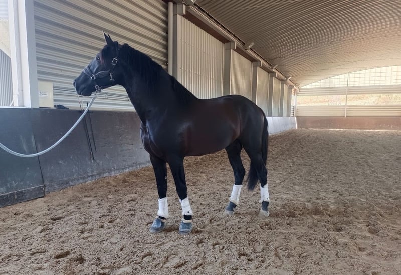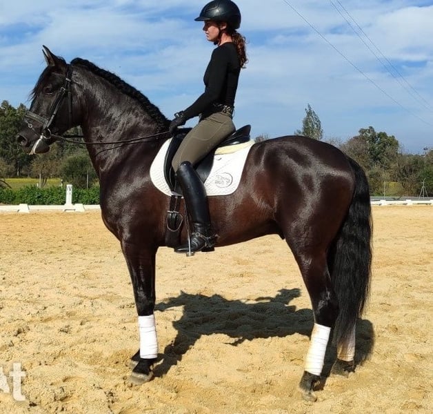 Silencio is a Black 5-year-old PRE gelding who was aptly named, as his name means “silence” or “quiet.” As a foal, he was very calm and kept to himself, and one might almost think that the breeder had forgotten about him. Of course, it wasn’t because this gelding was too inconspicuous. No, he is a beautiful horse with a very typical appearance. But he was definitely a late developer and, at 3 and 4 years old, simply not ready to be put to work. So he was castrated and allowed to run with the weanlings and young stallions until he was 5 years old. Silenzio’s bloodlines are influenced by Cartujano on his father’s side, and he is a grandson of Judio VII, sire of over 379 offspring and still holding the highest coefficient of 1.77 for “breed type.” The dam line goes through Educado X, a top sire in PRE breeding, awarded as an elite stallion, about whom not much needs to be said. Silencio is therefore a very successful example of “old” Carthusian bloodlines paired with modern influence via the mare. A gelding who was raised in a very species-appropriate manner, had time to grow and develop, was broken in late, and has X-rays with no findings. Silencio impresses with his friendly nature, his uncomplicated manner, and his appearance, and is an ideal horse for someone who wants to continue growing with him, as he is currently 5 years old and has been ridden in the basic gaits.