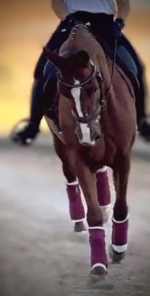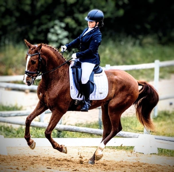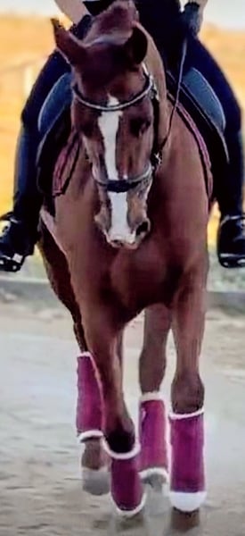 Fuchsia ...a beautiful 5-year-old gelding in the rare chestnut color, looking for his forever home. He is a kind-hearted and extremely friendly gentleman who is suitable for riders of all levels. Completely reliable and well-behaved, he enjoys hacking out, where he is not spooky and loves exploring new paths. In the arena, working with him is a pleasure, as he always stays close to his rider, responds correctly and sensitively to aids, and provides a secure riding experience. He has already achieved a promising level of training and has a pleasant, friendly demeanor. Perfect for ambitious riders seeking a reliable partner for dressage, or for a rider who is still gaining confidence, as he is incredibly calm and patient. He is capable of performing exercises such as leg-yields, traverses in all gaits, and is already jumping quite well with flying changes on both sides. Out hacking, he is very eager and absolutely trustworthy and safe. If you are interested in this handsome young fellow, please contact me with your phone number so I can get in touch with you as soon as possible. Feel free to contact me for further information or if you have any questions.