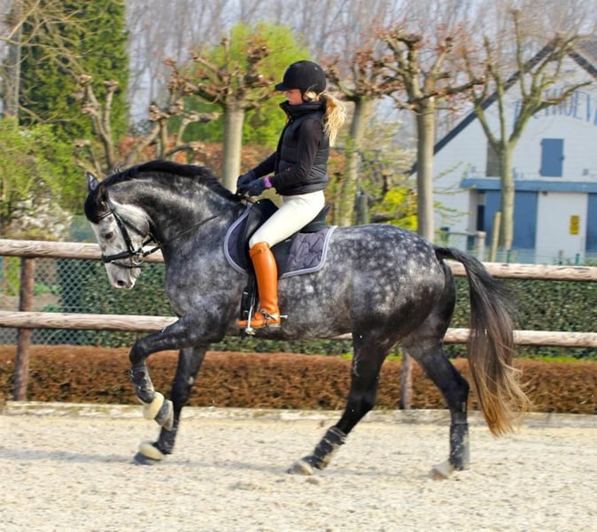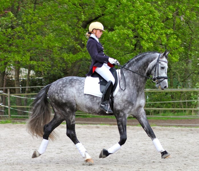 PRE mare DONJANA. At first a bit shy, this sweet girl now loves to be groomed and cuddled. This black pearl is super sweet, very sociable, and has excellent social behavior within the herd. But not only her beautiful baroque conformation and her wonderful color are strikingly beautiful. We were particularly impressed by this baroque beauty during her first ride. Although she was recently backed, DONJANA shows a pleasant diligence and incredible nerve strength under saddle. Additionally, her exceptionally comfortable movements make her a joy to ride. With her calmness and nerve strength, this wonderful mare is an ideal family and leisure horse. Whether in the arena or out on the trails, DONJANA is always with her rider and is not distracted by a lawnmower, barking dogs, or other external stimuli. DONJANA is not a mare that opens up to everyone immediately. But once she has given her heart to someone, this gem will be a loyal and reliable partner. X-rays are available.
