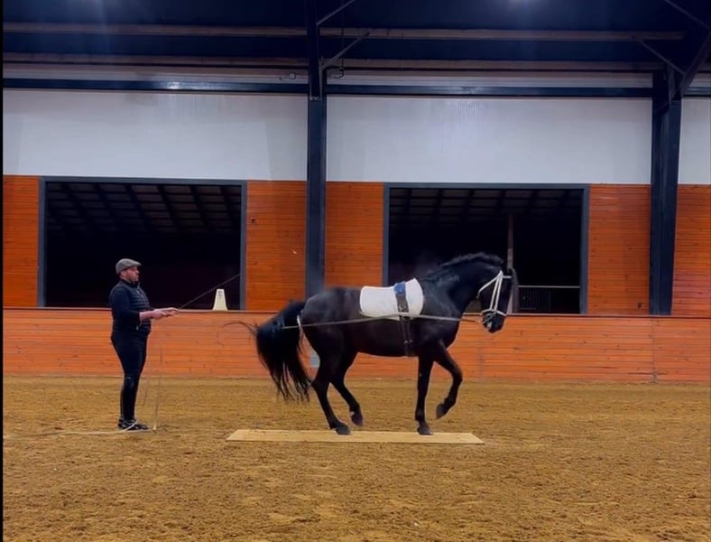 DRESSAGE IBERIANS Presents.... Diligente: 2020 Imported PRE Black Gelding, a stunning classically trained beauty! Imported from Spain and in classical training, this gentle beauty hails from a fabulous breeder in Spain, Yeguada Llorente. He stands just over16HH, is going under saddle and is awesome in the long lines with piaffe, Spanish walk, bow, pirouette. His trainer has glowing praise for him and his huge teddy bear personality. He is well proportioned, strong back, squarely built, naturally collected and very uphill. He is amateur friendly for an experienced rider in a training program who likes an energy bunny, as he is tireless and loves to work! This iconic beauty has tons of potential and will excel in style - perfectly suited for classical dressage, long lines, liberty exhibitions & working equitation. A dream come true for some very lucky person. To further evaluate him as a potential partner, contact us for more details about his bloodlines, training and demeanor. VIDEO LINK on our website or youtube channel. Ridden video coming soon. FB - Susan Andalusian Located near Athens & Atlanta, GA.