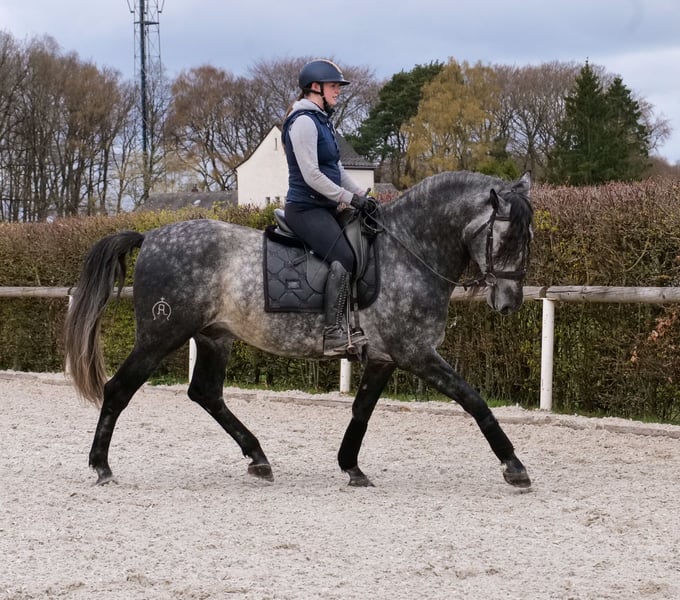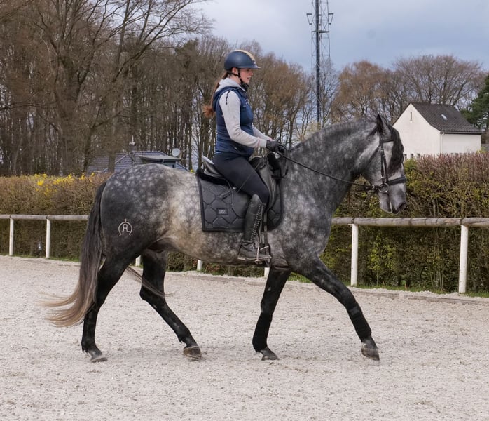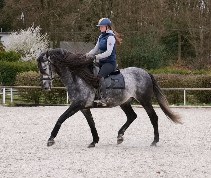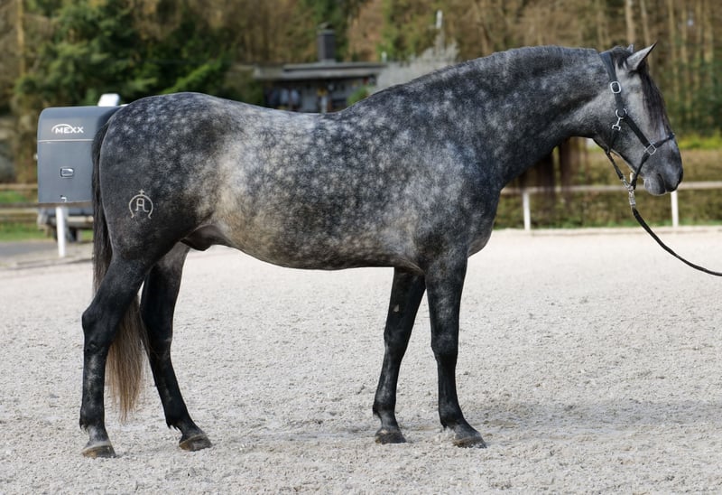 Name: Rey Cas Rasse: P.R.E Geschlecht: Wallach Geburtsdatum: 17.05.2020 Alter: 6 Stockmaß: 1.64m Farbe: Schimmel Abstammung: mit Abstammungsnachweis Charakter: menschenbezogen, lernwillig, verlässlich, neugierig, intelligent, mutig, gelassen Ausbildung/Eignung: geritten, Dressur, Freizeit, Barock, Working Equitation Geländeerfahrung: zuverlässig, unerschrocken, nervenstark, alleine und in der Gruppe Gesundheit: entwurmt, geimpft, Barhufer, ekzemfrei, Zähne kontrolliert, osteopathisch behandelt Haltung: Box, Paddock Besonderheiten: gute Grundgangarten, sehr sitzbequem, schmiede und verladefromm, herdenverträglich Die genannten Eigenschaften beruhen auf unserer persönlichen Einschätzung und stellen keine zugesicherten Merkmale dar. Preis: 12900€ (Bruttopreis) Haben wir ihr Interesse geweckt? Um Ihnen einen besseren Eindruck von Rey zu geben, senden wir Ihnen sehr gerne sein Reitvideo zu. Selbstverständlich stehen wir Ihnen für eine ausführliche Beschreibung des Pferdes, persönliche Beratung und zur Beantwortung aller Ihrer Fragen auch telefonisch zur Verfügung. Bitte schreiben Sie uns hierfür jederzeit eine WhatsApp Nachricht, oder rufen unter folgender Telefonnummer an: +49 15119487595 Unsere Telefonzeiten sind täglich von 7:00 - 13:30 sowie ab 20:00Uhr. Wir freuen uns über Ihre Kontaktaufnahme! Eine klinische oder Röntgenologische Ankaufsuntersuchung kann gerne vom Tierarzt Ihrer Wahl durchgeführt werden. Natürlich kann Rey sicher und komfortabel in sein neues Zuhause geliefert werden. Wir kümmern uns um alle notwendigen Vorbereitungen und den Transport, damit Ihr neues Pferd stressfrei, gut betreut, versichert und wohlbehalten im neuen Zuhause ankommt. Zurzeit präsentieren wir eine sorgfältig ausgewählte Vielfalt an Verkaufspferden. Bei uns finden Sie garantiert Ihr Traumpferd. Besuchen Sie uns auch gerne auf unserer Homepage unter: www.marvinsroyalhorses.de. Sehr geehrte Kunden, gerne stellen wir Ihnen unsere Pferde vor und führen, putzen, satteln, longieren, Bodenarbeit sowie Probereiten in der Reithalle, auf dem Platz oder im Gelände ist Ihnen möglich, um Ihr neues Familienmitglied näher kennenzulernen. Dieses kostet für ein Pferd 40€, für jedes weitere 30€ und wird beim Kauf wieder erstattet. Unsere Adresse lautet: Grube Ferdinand 50 53577 Neustadt Wied Google Maps: marvinsroyalhorses