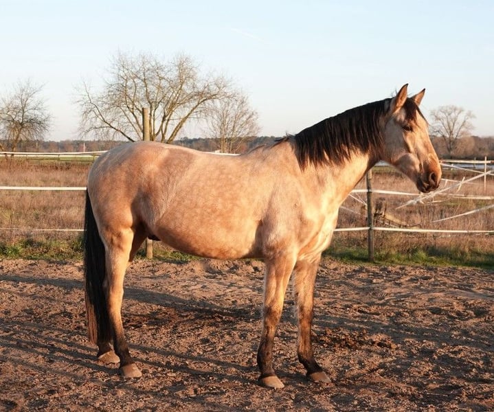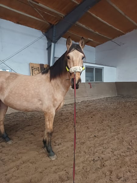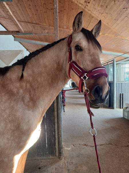 Schicker Allrounder sucht neues Zuhause Aufgrund von einer Bestandsverkleinerung wird ein ausdrucksstarker PRE Wallach verkauft – 6 Jahre, ca.1,66 m (wächst noch) – echter Allrounder, talentiert & charakterstark. Sein Charakter zeigt sich wie ein verschmuster großer Hund, der immer gefallen möchte und vom Temperament her, eher nicht einem typischen PRE ähnelt. *Aufgrund einer behandelten Magenproblematik weit unter Wert abzugeben*. Weiteres gerne auf Anfrage. Dieser reinrassige PRE beeindruckt mit einem schönen Ausdruck und einem liebenswerten, absolut verschmusten Wesen. Da er ein Spätentwickler ist, bekam er viel Zeit zum Entwickeln. Vom Boden aus ist er für alles zu haben, ob Longe, Doppellonge und die Anfänge einer Fahrpferdausbildung hat er kennengelernt und ist souverän dabei. Bodenarbeit, Spazieren gehen, Stangenarbeit, Freispringen, Handpferd Reiten kennt er auch, sowie im Dunklen unterwegs zu sein. Unter dem Sattel ist er noch völlig unverdorben. Steht artig beim Auf- und Absteigen, an der Longe sicher in den 3 GGA geritten. Frei Reiten macht er brav Schritt und Trab. Dies ist aber noch nicht gefestigt. Im Gelände zeigt er sich verlässlich – ob alleine oder in der Gruppe, er bleibt konzentriert und entspannt. Im täglichen Umgang ist er ein sehr braves Pferd, lässt sich überall anfassen und ist sehr sozial in der Herde. Selbstverständlich ist er regelmäßig mit Mineralfutter, Wurmkuren, Hufpflege, geimpft und Ostheopatisch versorgt und begleitet worden. Sein Fundament ist stabil und die Hufe top, da er über Stock und Stein Barhuf problemlos läuft. Besonders hervorzuheben ist seine starke Menschenbezogenheit: Er knüpft gerne eine enge Bindung zu seiner Bezugsperson und arbeitet motiviert mit, wenn das Vertrauen einmal aufgebaut ist. Ein idealer Partner für Reiter/ Fahrer, die ein völlig unverdorbenes, liebes und vielseitig talentiertes Pferd suchen, dass im Alltag wie im Training begeistert. Am Wohlsten fühlt er sich im Offenstall/ Koppel. Reine Boxenhaltung ist nicht gewünscht, da er absolut Robust ist und so auch gehalten wurde. Videos gerne auf Anfrage. Der Preis ist verhandelbar. Ein passendes Zuhause ist Wichtiger! Sein Zubehör kann auf Anfrage auch ggf mit abgegeben werden. Um Reittourismus vorzubeugen, erlauben wir uns für ein Probereiten 30€ zu berechnen, die beim Kauf verrechnet werden.