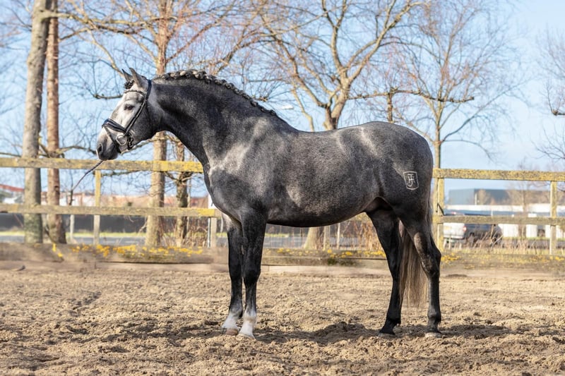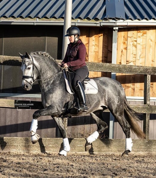 Deze prachtige 6-jarige PRE ruin (±166 cm) is een echte blikvanger met een gouden karakter, traumavrije manier zadelmak gemaakt. In de omgang is hij ontzettend braaf en nuchter: hij is lief bij de hoefsmid en tandarts, laadt makkelijk op de trailer en geniet zichtbaar van aandacht en knuffels. Hij werkt graag voor je en denkt fijn mee. Onder het zadel laat hij zich zien als een betrouwbaar en comfortabel paard. Hij is braaf op buitenrit en bekend met verkeer. Hij beschikt over een ruime stap en draf en een mooie bergopwaartse galop, waarbij hij nu al laat zien dat verzamelen in de toekomst geen probleem zal zijn. Met zijn uitstraling en bewegingen is hij zeker een paard om mee te shinen in de ring of op MCI-wedstrijden. Tegelijkertijd maakt zijn fijne karakter hem ook geschikt als toekomstig familiepaard. Hij is niet sensibel of ril, maar blijft uiteraard een jong paard. Daarom zien we hem het liefst terechtkomen bij een ruiter op L/M-niveau of iemand met ervaring met jonge paarden. Bij goed huis is prijs bespreekbaar. 🥕 Hij lust 12 wortels