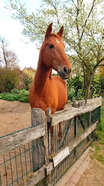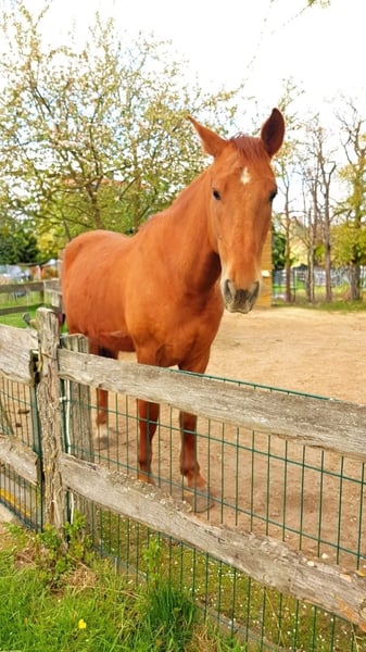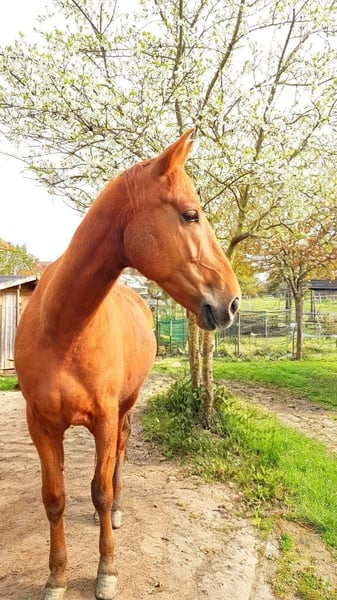 Pepe ma 7 lat, mierzy 160 cm wzrostu i dopiero zaczyna swoją edukację jeździecką. Jest bardzo łagodny i delikatny zarówno na lonży, jak i pod siodłem. Nie jest to koń dla osób o mocnych rękach. W stadzie zajmuje niskie miejsce i jest bardzo dobrze tolerowany przez innych. Pepe jest zdrowym i zadbanym koniem, obecnie przebywa w stajni typu open, ale z pewnością nie miałby problemu z innym systemem utrzymania. Przez kilka tygodni był w treningu, co wykonał świetnie. W terenie i w ruchu ulicznym jest odważny. Chętnie wyślę filmy z jazdy po osobistym kontakcie. Niestety muszę przyznać, że z powodu braku czasu nie jestem w stanie dalej szkolić młodego konia, dlatego szukam dla niego nowego, odpowiedniego domu. Pasujący hiszpański siodło z lamówką od Chrisa można nabyć za dodatkową opłatą. Obecnie koń nie jest w treningu i musi odzyskać masę mięśniową, dlatego jazda próbna nie jest możliwa dla dobra zwierzęcia. Koń jest również oferowany poniżej wartości rynkowej. Proszę o kontakt tylko w przypadku poważnego zainteresowania!