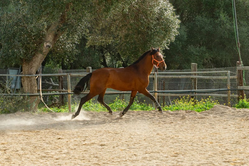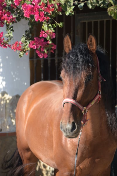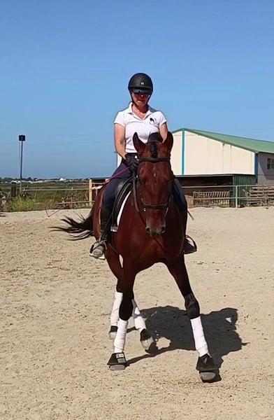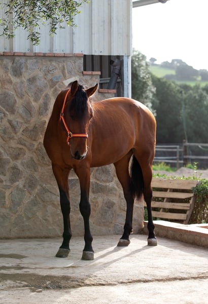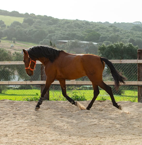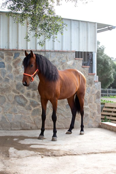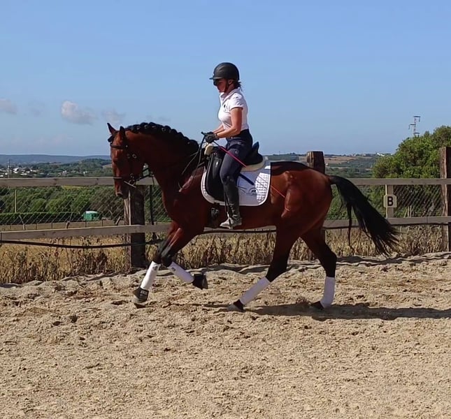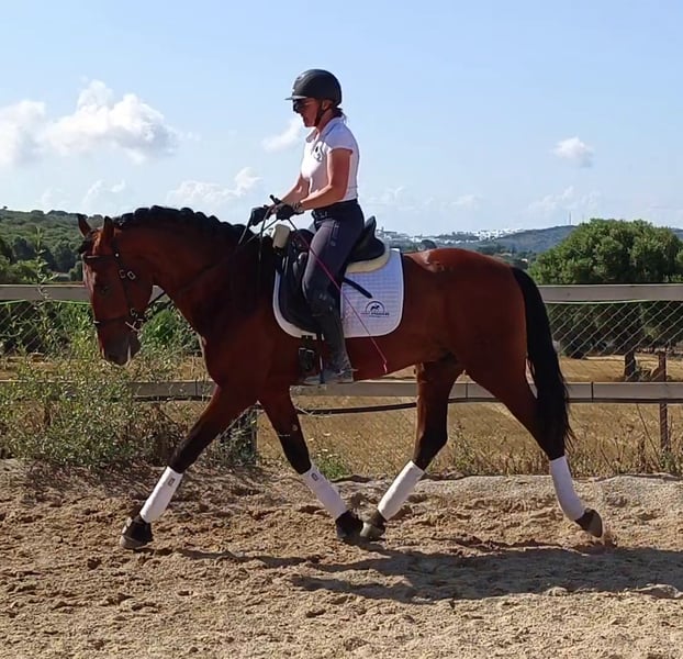 Dieser 2019 geborene ca 1,66m große braune PRE Wallach ist eine absolute Seele von Pferd. Man könnte meinen er wollte eher ein Schoßhund sein. Er kam direkt vom Züchter und wurde dort schonend angeritten. Zu Hause ist er in einer großen Paddockbox mit direktem Kontakt und Anschluss zu anderen Pferden, auch Hengsten. Er ist ein absolut freundliches und soziales Pferd. Unter dem Sattel präsentiert er sich fein in der Anlehnung, fein an den Hilfen und zeigt dabei immer Freude an der Arbeit sowie gute Grundgangarten. Er wird in den Grundgangarten geritten, kennt Schulterherein, Anfänge Travers sowie Anfänge versammelnder Übungen. Er geht gerne ins Gelände, ob allein oder in der Gruppe, kein Problem. Er vertraut nicht nur seinem Reiter, er gibt dem Reiter auch immer ein gutes und sicheres Gefühl, ohne dabei langweilig oder faul zu sein. Als Abwechslung zum Reiten kennt er die klassische Arbeit an der Hand, Longe, Doppellonge, Stangenarbeit oder einfach nur faul in der Sonne dösen. Er ist gewöhnt an laute Maschinen und Fahrzeuge, freilaufende Hühner, die auch mal auf dem Reitplatz auftauchen, Kühe, Hunde und vieles mehr. Absolut unerschrocken meistert er alles, und wenn er es mal lustig findet sich zu “erschrecken”, immerhin ist er noch ein junges Pferd, ist er immer kontrollierbar ohne großen Aufwand. Er ist ein vielseitiges Pferd und für jeden Spaß zu haben. Er liebt Menschen, einfach ein toller Partner, aber möchte auch beschäftigt werden. Sein 2 Jahre älterer Vollbruder ist bereits erfolgreich in seiner Altersklasse im Dressursport unterwegs. Info können gerne verschickt werden. Röntgenbilder vom September 2022 sind vorhanden. Er ist Piro negativ, geimpft, regelmäßig entwurmt sowie dem Schmied vorgestellt, Zähne wurden gemacht. Er ist beschlagen und wird auf Wassertrense geritten. Er wurde im Februar 2024 gelegt. Natürlich kann er noch zur weiteren Ausbildung bei uns bleiben. Bei ernst gemeintem Interesse leite ich gerne weitere Informationen weiter. Wir sprechen Deutsch, Englisch und Spanisch. Alle Preise verstehen sich ohne MwSt. und ohne Transport!