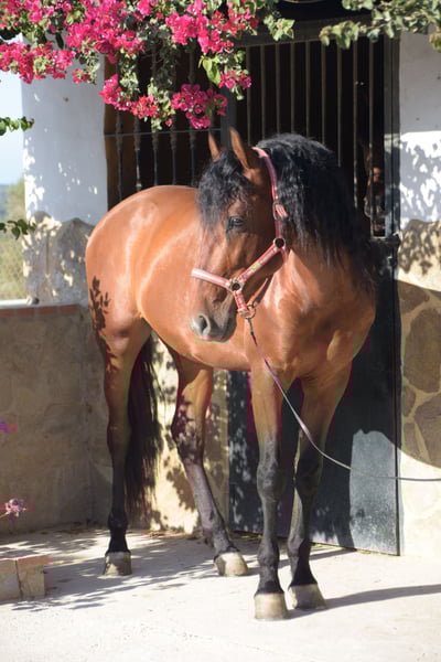 This 2019 born about 1.66m tall brown PRE stallion is an absolute soul of horse. You might think he wanted to be more of a lapdog. He came directly from the breeder and was gently ridden there. At home he is in a large paddock box with direct contact and connection to other horses, including stallions. He is an absolutely friendly and social horse, without stallion manners. Under the saddle, he presents himself fine in leaning, fine on the aids and always shows joy in the work as well as good basic gaits. He likes to go off-road, whether alone or in a group with mares, no problem. He not only trusts his rider, he also always gives the rider a good and safe feeling without being boring or lazy. As a change to riding, he knows the classic work on the hand, lunge, double lunge, pole work or just lazily dozing in the sun. He is used to noisy machines and vehicles, free-roaming chickens that sometimes appear on the riding arena, cows, dogs and much more. Absolutely fearless he masters everything, and if he finds it funny to "scare" himself, after all, he is still a young horse, he is always controllable without much effort. He is a versatile horse and fun for everyone. He loves people, just a great partner, but also wants to be busy. His 2 years older full brother is already successful in his age group in dressage. Info can be sent. X-rays from September 2022 are available. He is Piro negative, vaccinated, regularly dewormed and presented to the blacksmith, teeth were made. He is shod at the front and is ridden on water trense. On request, it can be laid on site. Of course, he can stay with us for further training. If you are seriously interested, I will be happy to forward further information. We speak German, English and Spanish.