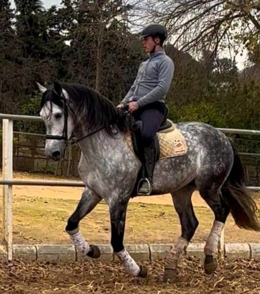 Tutto ciò che è fantastico di lui è il suo buon carattere: nobile, facile da gestire, con quell'atteggiamento calmo che rende tutto più semplice. Ciò che davvero lo rende interessante è la sua capacità di adattarsi alle tue preferenze: può essere montato con un bridon a cavezza e sella da dressage, oppure con un morso a leva e bardatura da equitazione di lavoro. È un cavallo molto versatile, perfetto se desideri divertirti sia in uno stile più "campero" che in arena. Ha energia e risponde prontamente agli aiuti. In arena si comporta molto bene, e all'aperto mantiene lo stesso atteggiamento. Esce da solo o in compagnia, con un passo piacevole e buon temperamento. In dressage, è stato introdotto agli esercizi laterali: già esegue il traverso e il shoulder-in, con una base solida che permette di proseguire con serenità, sfruttando il lavoro. IberHorse: Da oltre 14 anni selezioniamo cavalli iberici per una clientela internazionale. Se questo PRE (Puro Sangue Spagnolo) versatile e affidabile si adatta al tuo progetto, contattaci: organizzeremo una videochiamata per conoscerlo senza uscire di casa, o un appuntamento per vederlo di persona.