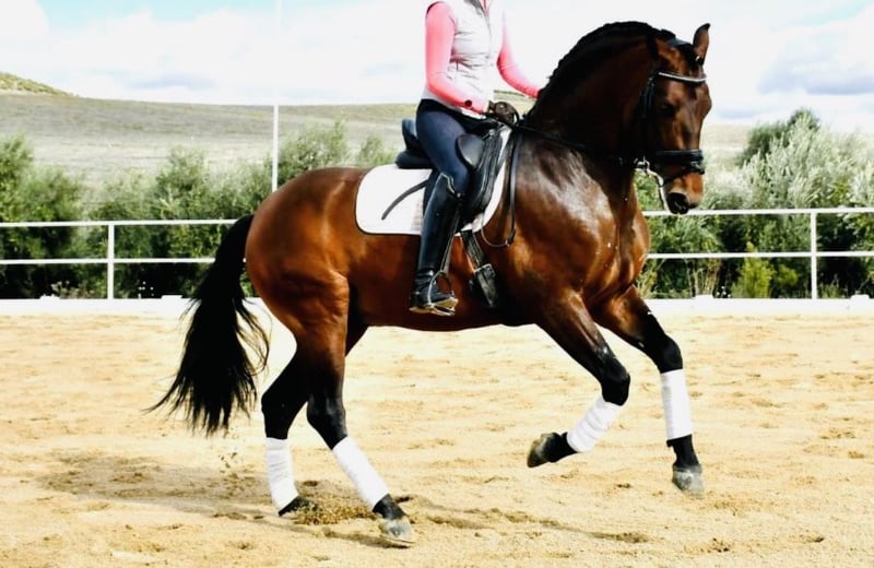 Jong paard, 6yo, 16.1u en goed van geest. Met een goed dressuurniveau, bevestigde bakwissels, laterale oefeningen en met hem kun je zonder angst met andere paarden over trails lopen. Een zeer compleet paard, lichaamsbouw met veel schoonheid, geest en een goed niveau van dressuur. Elke ruiter zal van hem kunnen genieten.