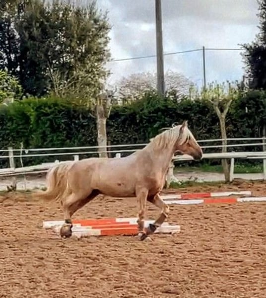 A fairy-tale beautiful PRE gelding, looking for his forever home 🏡 He captivates with his special Palomino color and stunning appearance — a horse straight out of a fairy tale. 🦄 Coco is 9 years old and stands 16.1 hands high. He has a strong build and can comfortably carry a bit more weight. His temperament is gentle and affectionate, but he also has his own opinions, which may occasionally differ from those of his rider. Once convinced with cleverness, he is a real treasure. His pleasant temperament makes every training session and ride a true pleasure. He is not suitable for complete beginners! Coco is perfectly rhythmical and easy to sit. His trot features a pronounced suspension phase with very good back engagement. His canter is calm, uphill, and steady. His walk is also quite impressive. He enjoys working in the indoor arena or on the riding school paddock. He also goes out into the field — although initially, he may be reluctant to leave the farm. Once in the terrain, he is fearless and not spooky at all. His strength lies in dressage work. Due to his owner’s professional commitments, he has not been extensively trained yet. He handles the basics very well, and work on simple lateral movements has begun. If you are looking for an unspoiled, willing, and beautifully marked dressage horse, he is a perfect match. If you are interested in this fairy-tale beautiful horse, please contact me with your phone number so I can get in touch with you as soon as possible. Location: Italy, near Rome. A veterinary examination can be arranged at any time at the owner’s expense.
