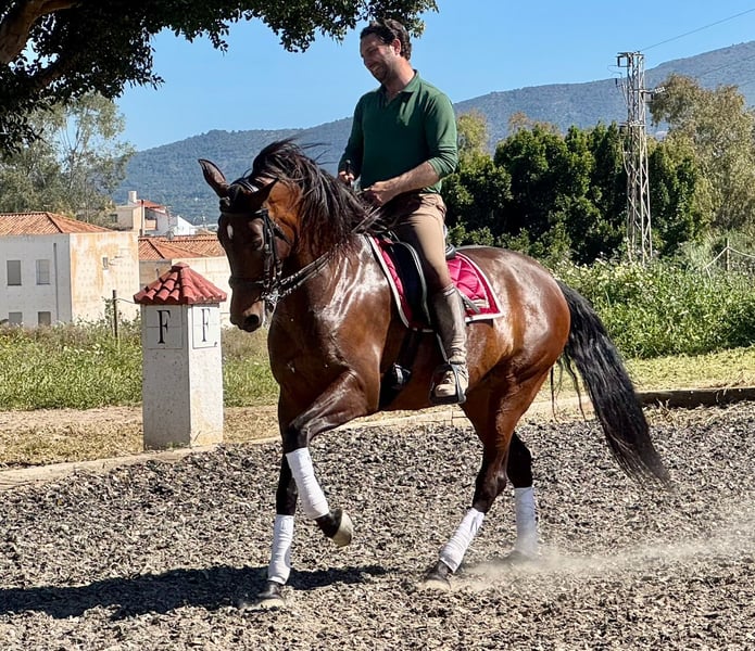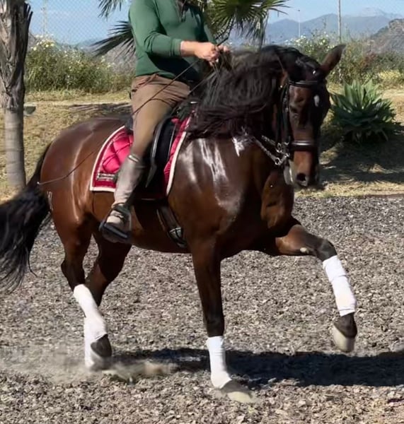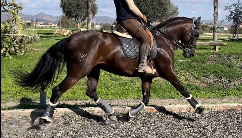 For sale is an impressive PRE mare, born in 2015. This elegant bay captivates with her charming appearance and excellent training. With a height of 163 cm, she offers the optimal size for a variety of uses, both in the dressage arena and for relaxed rides in nature. This mare stands out not only for her looks but also for her balanced character and willingness to learn. She is always motivated and shows great potential for further training and development. Location: Spain - transport can be organized worldwide.