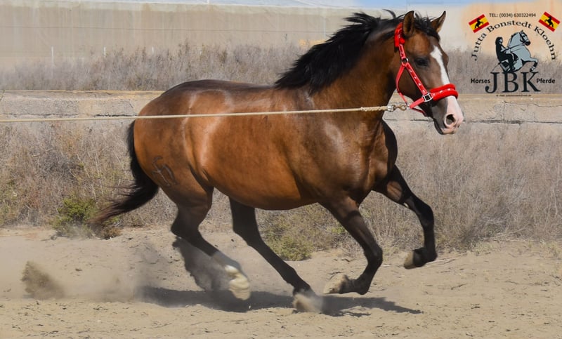 This charming Plaza de Armas mare was born on March 7, 2013. Her activities have so far been exclusively in breeding. Her movements are very expressive with a lot of go. Her character is absolutely delightful. She is very well socialized, gets along excellently in a herd, and she is an excellent mother. So far, she has given birth to 5 foals for the Hispano-Arab breeding, in which she serves as a broodmare. She has never been ridden, but she is familiar with saddle placement and lunging. Her height is 1.60 m.