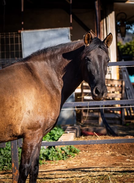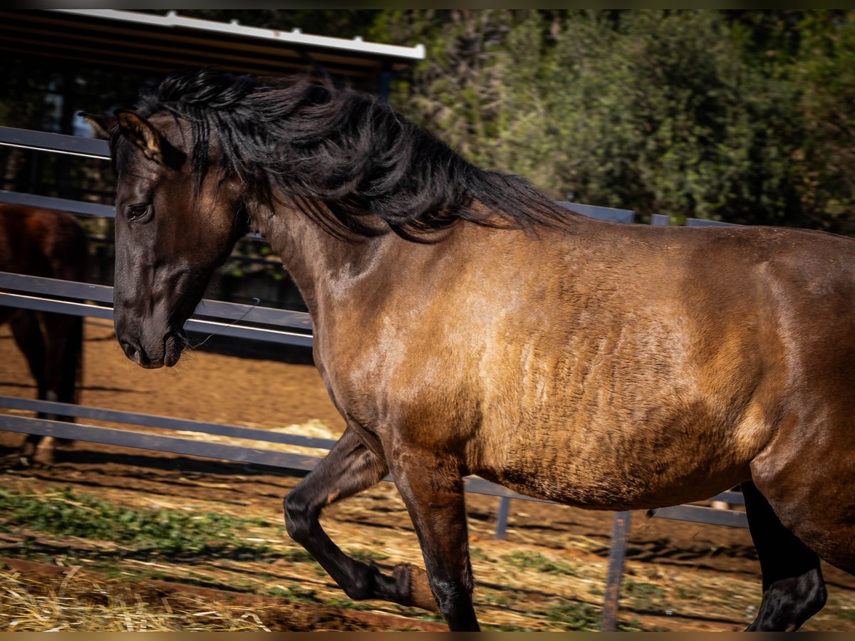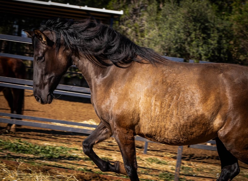 The beautiful PRE mare Festiva enchants with her rare color Smokey Black (Dun) and stands in the stallion type. With her harmonious size and elegant charisma, she is an absolute eye-catcher. Festiva is a true lady of the heart - she loves to be cuddled extensively and is a friendly and confident leader in our small group of three. Another highlight: Festiva is expecting her first foal! The sire is an impressive Isabelo stallion and the birth of this little miracle is expected in March/April 2025 (ultrasound confirmed). We are already full of anticipation for this promising young horse. The mare can also be purchased individually after weaning. Festiva is fed a very natural and varied diet: alfalfa, green oats, fresh twigs, carefully selected herbs and high-quality minerals ensure an optimal supply. She is familiar with both electric and metal fences and lives with her stable mates in an open stable - an environment in which she is very social and relaxed. If you would like to know more about Festiva or see more pictures (including the stallion), please write me a PN!
