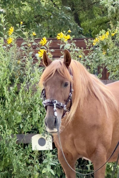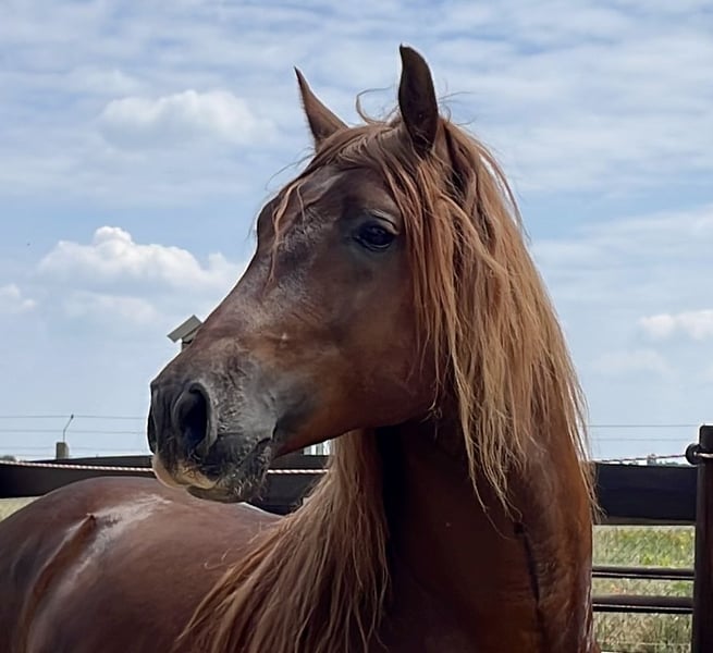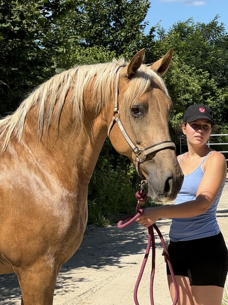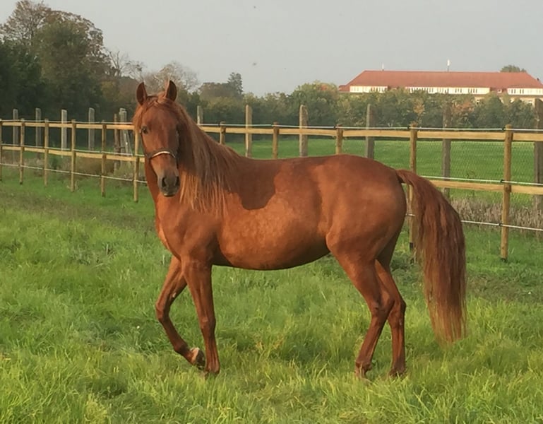 Mágica en Rojo, translated as The Enchantress in Red, born in 2011, flaxen chestnut color. In Mágica en Rojo, nobility and gentleness are united. She is relaxed and calm, a treasure to handle. Her movement is first-class, wonderfully energetic, ground-covering, and rhythmically correct, without Campaneo (paddling). Mágica is always friendly and balanced with a gentle fire. Her willingness to work and learn is wonderful. She is purely bred from the Escalera line. This line is famous for its outstanding horses and is selected based on strict criteria for beauty and, above all, athletic performance. These horses embody an ideal: dry, noble, slightly convex heads with fine ears, the tips of which are slightly bent inward. More rideable yet still conforming to the type of Pura Raza Española necks. A straight, almost square top line with good saddle position, and very good angulation of the hindquarters, to name just a few features. Her father Unido IX (Kingdom) lives up to his name. His breeder is none other than Dona Maria Dolores Cortes de la Escalera. He is an impressively beautiful chestnut stallion, very easy to handle, and demonstrates his versatile talent in dressage, at fairs as a parade horse, and in harness. Her mother Rociera LI comes from the renowned breeding of Don Hermanos Molero Malo. She has a wonderful character and produces outstanding foals. She herself embodies the typical Escalera-bred horse with great dressage potential. As we love, Mágica en Rojo is of bright chestnut color completely without white markings. She is a light chestnut, her mane is lightened by the flaxen gene, as is her tail, which in Spanish is referred to as "sorrel." Mágica was one of our successful broodmares; she had four very good foals and is currently being worked academically on the ground. She knows the saddle and everything else that comes with being a riding horse, and we have already had the opportunity to sit on her back a few times at a walk. Mágica knows the lunging system; she is regularly used for conditioning training with us for variety and muscle building. For Mágica, as for all our horses for sale, we primarily wish for a kind person with a sense of responsibility who treats themselves and the horse with care and patience. Our horses are completely unspoiled and have only had good experiences. The height was measured at three years during the inspection. Mágica is vaccinated against influenza, tetanus, and West Nile and is dewormed four times a year. She has always been healthy. https://www.treidelhof-gestuet.de/pura-raza-espanola-zucht/zuchtstuten-pre/m%C3%A1gica-en-rojo/