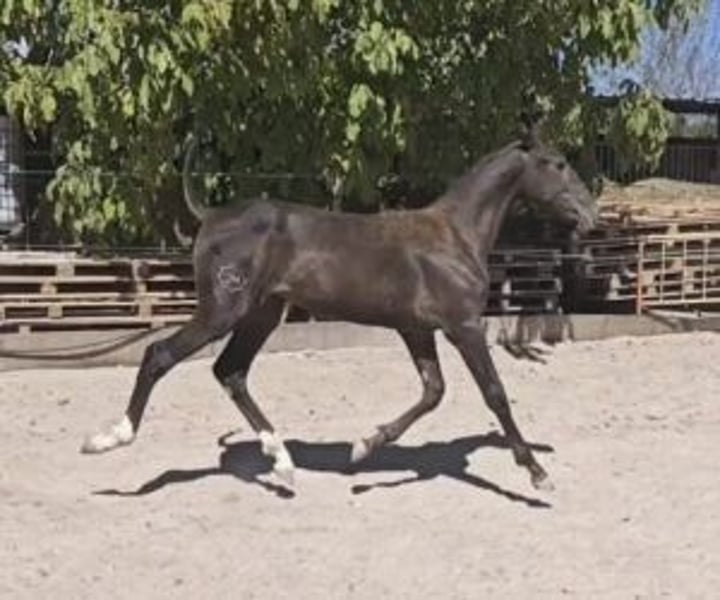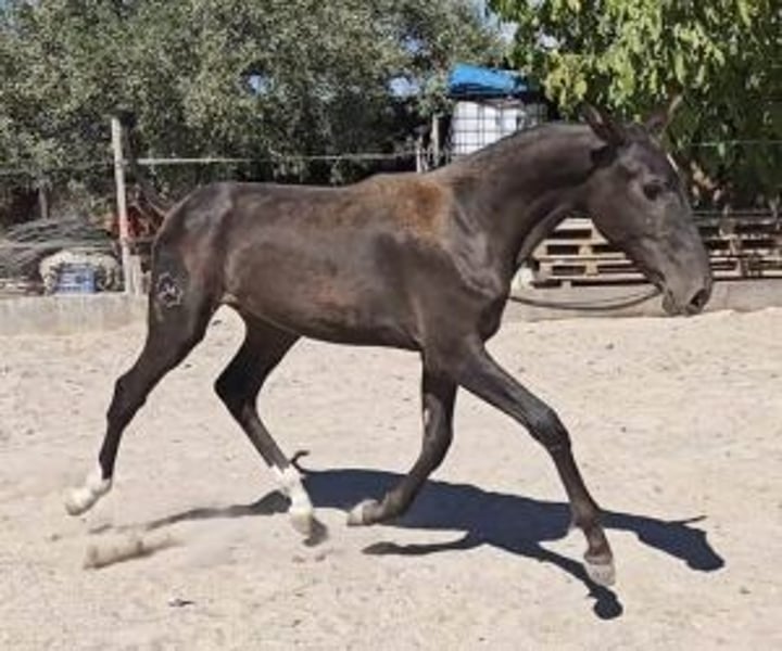 Black and elegant: bet on her, you have everything to gain. This filly is not just any old filly. She's the kind of mare who, if someone takes her training seriously, will make people talk about her. She possesses ample, expressive smiles, with a natural rhythm that already allows us to imagine her on a track in a few years, well-crafted, assertive, making a difference. And the most interesting thing is that she's still a complete work in progress. A sound filly, without flaws, without bad habits to correct. Ready to be shaped from the ground up. Her origins are very interesting, both functionally and morphologically. And this is evident in each of her movements. She has structure, drive and a real presence. She comes from a father measuring 1,68 m and a mother of 1,72 m, several times medalist in morphological competitions. It is therefore highly likely that she will take a lot of sizewhich makes her even more valuable for an ambitious project. That is why we particularly recommend her to a professional or experienced horse rider who wishes to raise their own mare and train her to their own liking from the start. And one crucial point: she has already passed the genetic test for coat. Phenotypically, she is black. And genetically: 🧬 gg aa ee CC NN Which means : She will never produce grey (gg), nor diluted coats (CC NN) She always transmits the "a" gene (recessive black). She can produce black foals if the standard provides E Also chestnuts (if the cross produces ee) And bays/browns if the stallion brings A No uncertainty. Everything is clear from the start. If you are looking for a medium-term project, with a mare that will offer you not only a great training experience, but also a solid foundation for breeding… so this filly deserves your full attention. At IberHorse: We select horses with high standards and a long-term vision. If this profile matches your project, contact us to arrange a viewing. Sometimes, great mares begin with a smart choice.