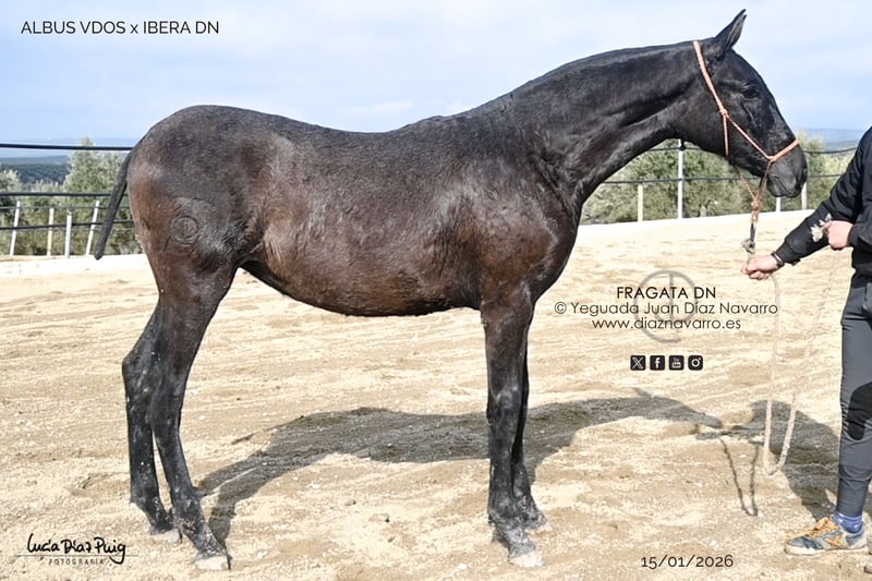 Potra nacida en 2025 – Potencial excepcional** Presentamos una hermosa potra torda, aunque nacida castaña/negra, nacida en 2025, con un carácter tranquilo y con un potencial muy bueno para la doma. Tiene un carácter muy dulce e inteligente. Muestra una estructura sólida y bien proporcionada, con un movimiento natural y una buena disposición para la doma. Su edad la convierte en una excelente opción para un proyecto de entrenamiento a medio plazo, con un potencial destacado en doma clásica o como yegua de cría para una ganadería. Perfecta para jinetes que desean criar o desarrollar un caballo con carácter y belleza, esta potra promete convertirse en una pieza clave en cualquier equipo ecuestre. Su genética proviene de caballos con excelentes resultados en doma, como Velero XI o Albus VDOS. Líneas: Velero XI, Rumex, Bizarro XIV, Levitón, Obcecado, Llamativo II. Ventura Camacho, Granda, Yeguada Militar, Vizconde de la Montesina, Fernández Daza, Urquijo, D. Benito Zoido, Bohorquez. No dudes en contactarnos para más información o para concertar una visita y conocerla en persona. diaznavarro.es/fragata-dn WhatAapp: +34 629773610