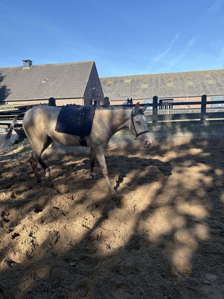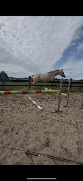 Bonita de Vera, super mooie Champagne merrie van 2 jaar met veel potentie. Ze heeft 3 correcte gangen, een sprongetje vind ze geweldig, door de bak crossen doet ze als een pro en grondwerk pakt ze goed op. We zijn sinds een maandje begonnen met longeren, ze doet het super maar heeft wel iemand nodig die consequent is en stevig in zijn of haar schoenen staat. Borstelen vind ze geweldig. Ze is heel aanhankelijk en mensgericht, ze leert snel en is heel erg slim. Is ontwormd en ingeënt, keuren mag K.K. ze gaat weg omdat ik haar niet kan geven wat ze nodig heeft, ze is een pittig paard en heeft iemand nodig die haar op haar plek zet. Ik zelf ben te zachtaardig en zo loopt ze over me heen. Ze is interessant voor elke discipline, zowel springen als dressuur en cross maar door haar speciale kleur ook geschikt voor de fok. Prijs staat niet vast, graag een bericht sturen.
