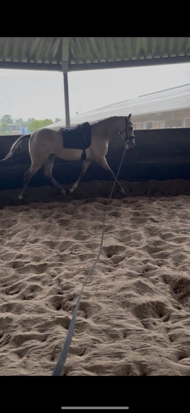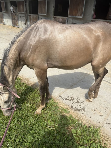 Bonita de Vera, super piękna klacz Champagne w wieku 2 lat z dużym potencjałem. Ma 3 poprawne chody, skoki sprawiają jej wielką radość, a przejazdy przez ujeżdżalnię wykonuje jak profesjonalistka, dobrze radzi sobie również z pracą z ziemi. Od miesiąca zaczęliśmy z nią lonżować, świetnie sobie radzi, ale potrzebuje kogoś, kto będzie konsekwentny i pewny siebie. Szczotkowanie sprawia jej radość. Jest bardzo towarzyska i skupiona na ludziach, szybko się uczy i jest bardzo inteligentna. Została odrobaczona i zaszczepiona, badanie weterynaryjne możliwe po uzgodnieniu. Sprzedaję ją, ponieważ nie mogę jej dać tego, czego potrzebuje, jest energicznym koniem i potrzebuje kogoś, kto postawi ją na miejscu. Ja sam jestem zbyt łagodny, przez co ona mnie przegania. Jest interesująca dla każdej dyscypliny, zarówno skoków, ujeżdżenia, jak i crossu, ale ze względu na jej wyjątkowy kolor również nadaje się do hodowli. Cena nie jest ustalona, proszę o wiadomość.