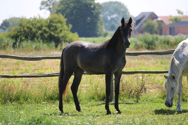 Canela del Abadia ist ein athletisches, langbeiniges Stutfohlen, das am 04.03.2024 bei uns geboren wurde. Ihre Mutter ist unsere Gründerstute Gracia IV, ihr Vater ist der Elitehengst Doblón-TR (siehe letztes Bild). Canela wächst bei uns in der Herde auf. Sie ist täglich an der Hand und kennt bereits eine schöne Grundarbeit am Boden und an der Longe, wo sie sich schön vorwärts zeigt. Sie steht schön still im Waschraum und wurde schon mehrmals transportiert. Wenn Sie mehr Informationen über Canela haben möchten, können Sie uns gerne eine Nachricht schicken. Sie sind jederzeit herzlich eingeladen, unseren Zuchtbetrieb zu besuchen!