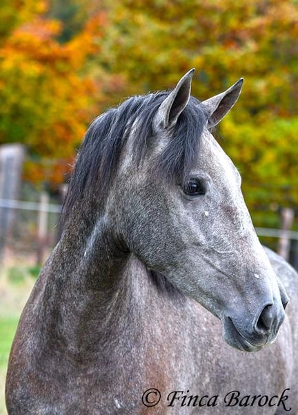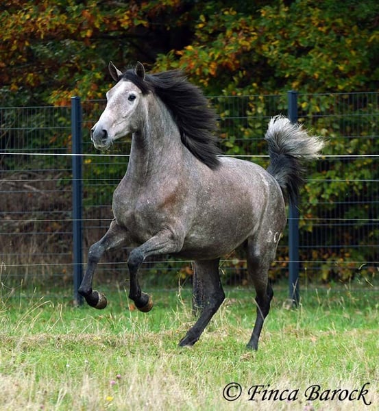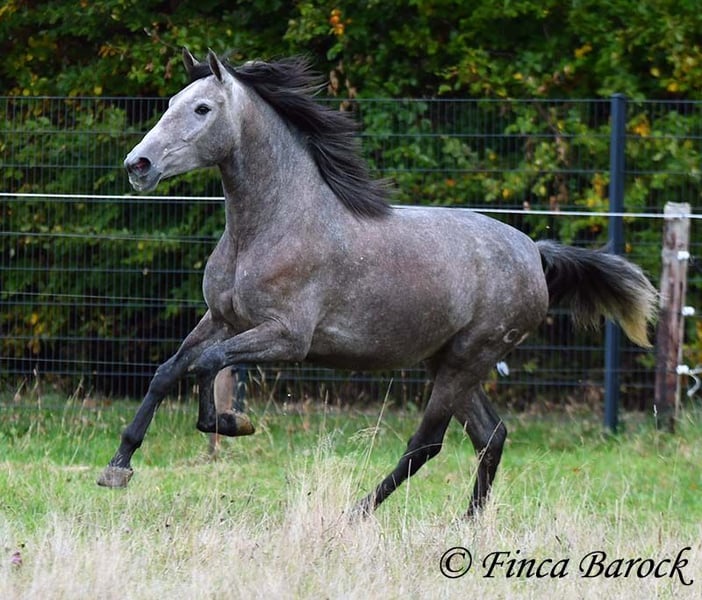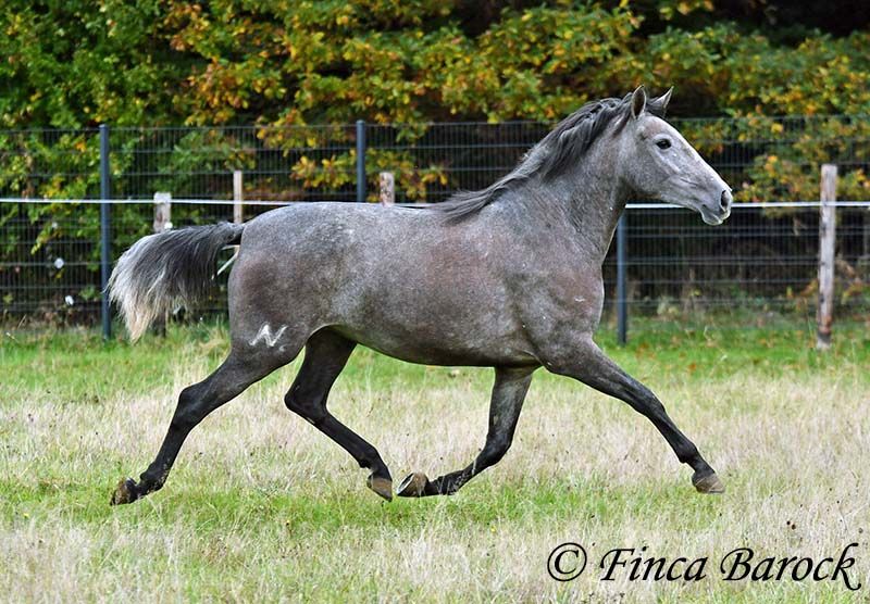 Rasse: PRE Name: Hechicera MCIX Geschlecht: Stute Stockmaß: ca 158 cm Alter: 01.03.2022 Farbe: Schimmel Preis: 9800 € Vater: Al Caprichoso v. Sir Hacendado Mutter: Bienvenida Nadales v. Grandioso de Nadales Hechicera, kompakte Statur, vereint mit super freundlichem Wesen und sitzbequmen Bewegungen. Hechicera ist eine imposante Erscheinung und mit ihren 3,5 Jahre bereits jetzt sehr kompakt. Sie steht noch voll im Wachstum und wird insgesamt noch etwas auslegen und wachsen. Hechicera ist solide in den GGA longiert am Kappzaum. Sie kennt an der Longe Stangenarbeit, Cavaletti und auch Spaziergänge an der Hand. Sie wird aktuell von uns angeritten und ist bereits in den GGA an der Longe mit Reiter sehr souverän. Das freie Reiten nehmen wir immer mehr dazu und auch hier zeigt sie sich vorbildlich. So lernt Sie Stück für Stück mehr das Leben als Reitpferd kennen. Sie zeigt sich als sehr gelehrig und ist eine absolute Musterschülerin! Hervorzuheben sind auch ihre sitzbequemen Bewegungen und Ihr traumhafter Bergaufgalopp. Sie kennt Herdenhaltung und zeigt sich hier sehr verträglich mit anderen Pferden. Mit Hechicera bekommt man eine tolle junge Lady, die bereits gute Grundlagen gelegt bekommen hat und darauf wartet weiter die Welt zu entdecken. Mit einem gutem Fundament und Rahmen, welche auch größere Reiter gut abdecken kann. Dazu trägt Hechicera den Brand von Yeguada Nadales und wäre mit ihrer Abstammung auch für Zucht interessant. inkl. klinischer tierärztlicher Untersuchung und Röntgenbildern Kontakt: Finca Barock, Tel. 0173-696 31 81, 56291 Wiebelsheim