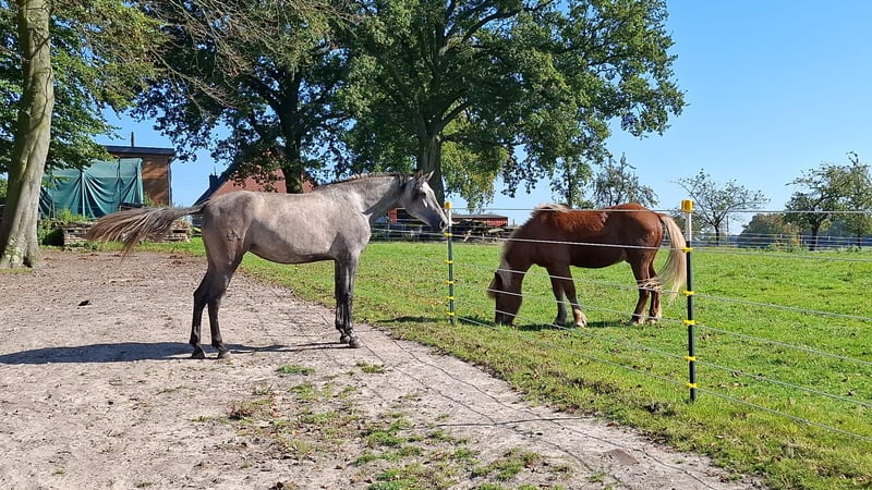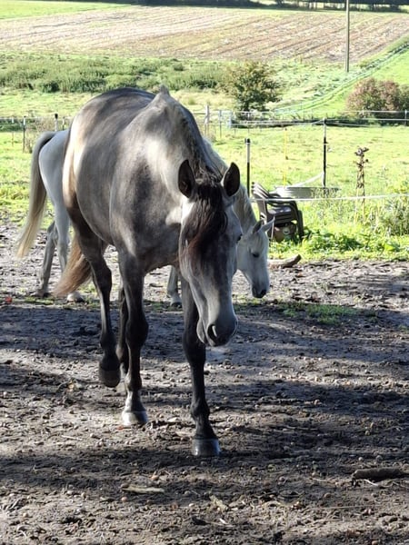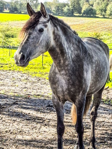 Vanwege ernstige gezondheidsproblemen moet ik mijn geliefde 4-jarige PRE-merrie met pijn in het hart herplaatsen. Mijn meisje is voor mij de allerbeste ter wereld, maar ik kan haar niet meer de juiste zorg bieden en zoek daarom een 5-sterren thuis voor haar. Ze is vriendelijk in de omgang, gaat graag naar de smid, die beweert dat hij in de afgelopen 15 jaar zo goede hoeven niet heeft gezien. Het vervoer in de trailer is geen probleem, en de dierenarts heeft goede kaarten bij haar, ondanks dat hij haar alleen heeft gezien voor vaccinaties en controles. Wat de opleiding betreft, moet ik toegeven dat ik haar vooral vanwege mijn gezondheidsproblemen alleen aan de longe heb gereden. We oefenen regelmatig gehoorzaamheid, beweeglijkheid en souplesse. Wandelen is ook zonder problemen mogelijk. Bij twijfelachtige situaties kalmeert ze zich met zachte woorden en is ze snel weer bij de les. Pardy is knuffelig en aanhankelijk en woont in een gemengde openstalgroep met 24/7 toegang tot hooi. Ze staat onder de leidende merrie qua rang. Zelfs als ze eens prikkelbaar is, is ze nooit onrechtvaardig of kwaadaardig. Zelfs als ze op de verste wei staat, komt ze op fluitje naar me toe. Ik wens voor haar een eigenaar met paardenkennis die met haar door dik en dun gaat. Een openstal met vrije toegang tot hooi is een vereiste. Door haar bloedlijnen is ze vrijwel geschikt voor alle disciplines. Handelaars hebben bij ons geen kans! Plaats gaat voor prijs.