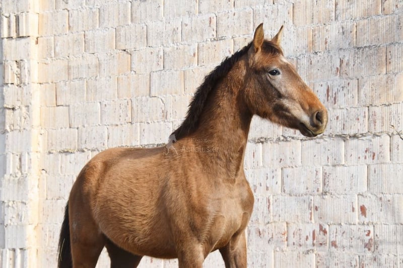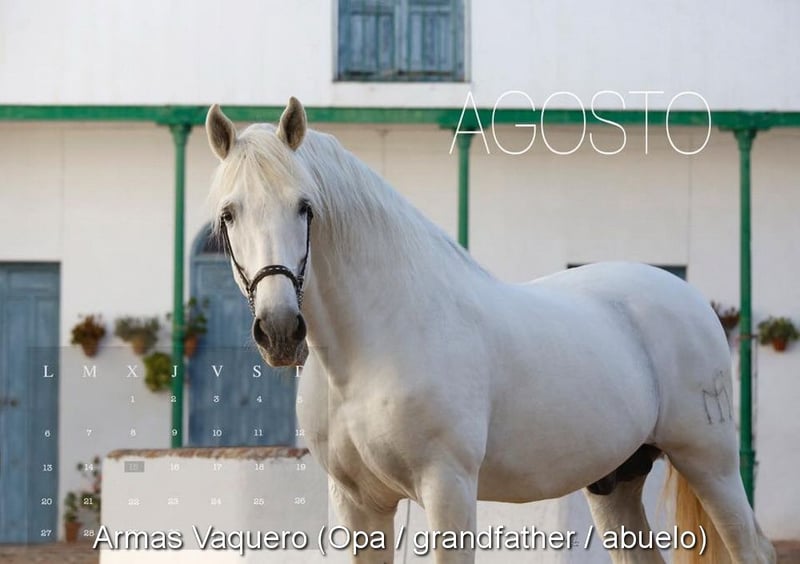carácter amable, curioso, sin domar, vive afuera con otras yeguas, grande, buenos movimientos y linaje, Linaje: Plaza de Armas, Yeguada Torreluna, Yeguada Vilaire, abuelo Solano de Trujillo y bisabuelo Yaco de Torreluna están calificados www.elegante-andalusier.com