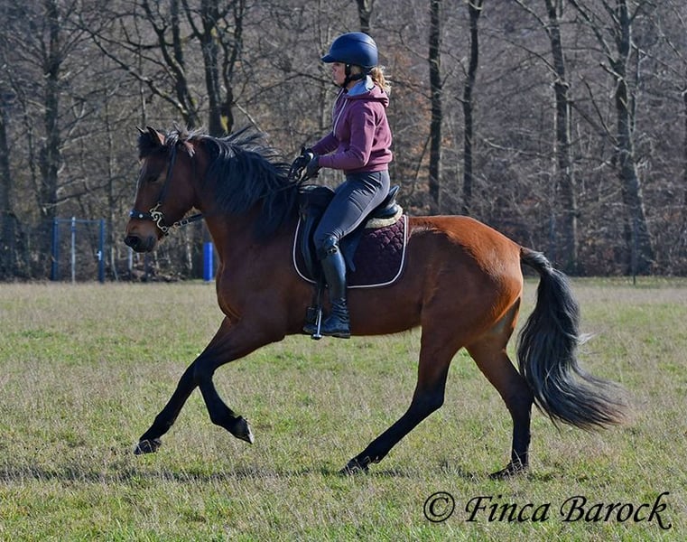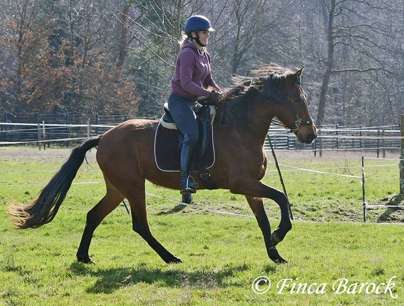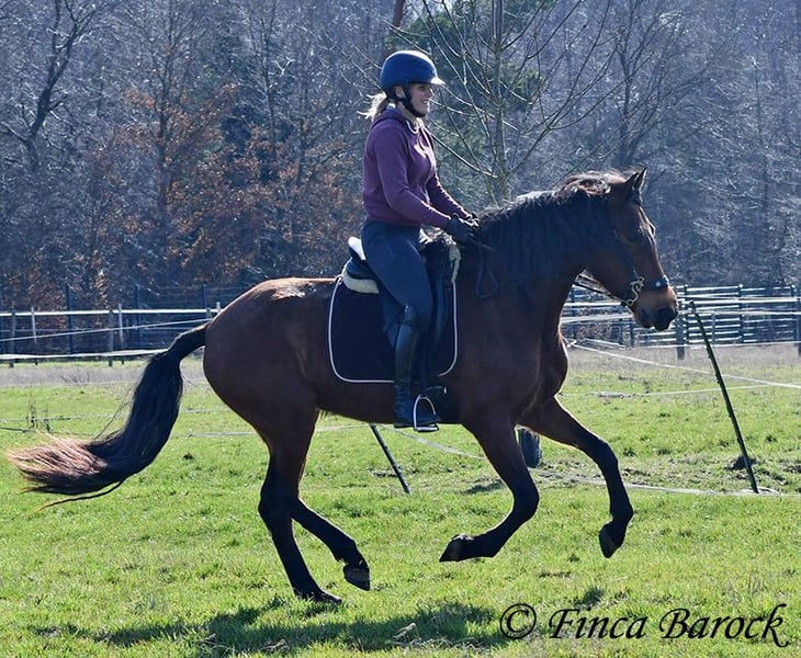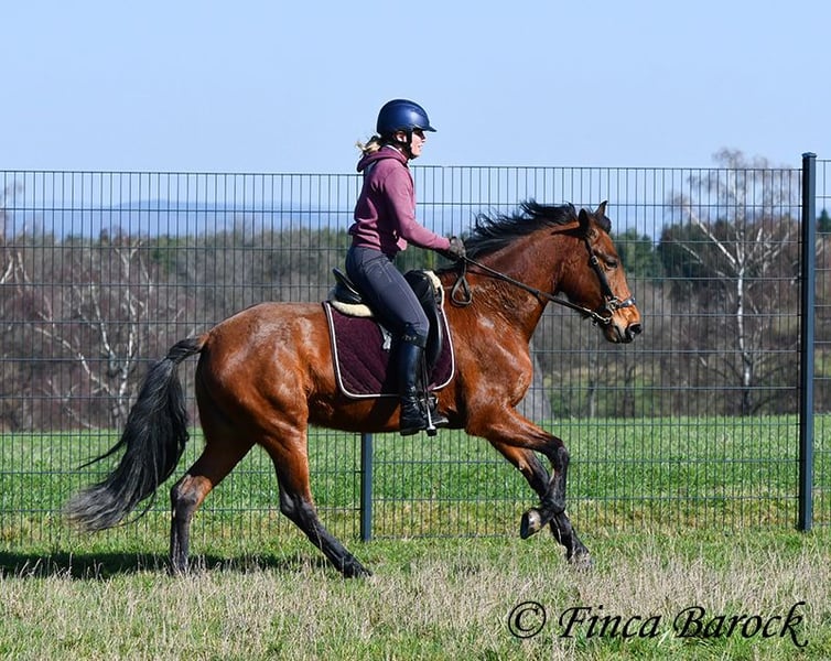 Breed: PRE Name: Caprichosa CDXV Gender: Mare Height: 1.60 m Date of Birth: March 8, 2021 Color: Brown Price: €8,000 Sire: Malevolo del Pas by Cubanon (Joven Reproductor) out of Ermitaño III (Majorante + Elite) Dam: Temprana Noble by Indiano LVI Caprichosa is a lovely, slender, and expressive mare with a friendly temperament. She was purchased to be used as a broodmare. However, life sometimes takes unexpected turns, and her owner’s plans could not be realized due to personal reasons. During the summer, the sweet Caprichosa enjoyed time on the pasture and was only ridden occasionally. Currently, she is being retrained with us. Under saddle, she proves to be eager to work, comfortable in the seat, diligent, and quick to learn. Caprichosa has been ridden in the arena and is also familiar with trail riding. She is attentive, briefly surveys new surroundings, but is then easily convinced to continue. Overall, she prefers outdoor riding over arena work and feels completely at home in the terrain. She has a spacious, expressive trot and a fantastic uphill canter. Her movements are characteristic and seat-friendly. She also shows willingness to jump small obstacles and could be versatile in her training. A wonderful mare with solid foundations, ready for new adventures! Contact: Finca Barock, Tel. 0173-696 31 81, 56291 Wiebelsheim