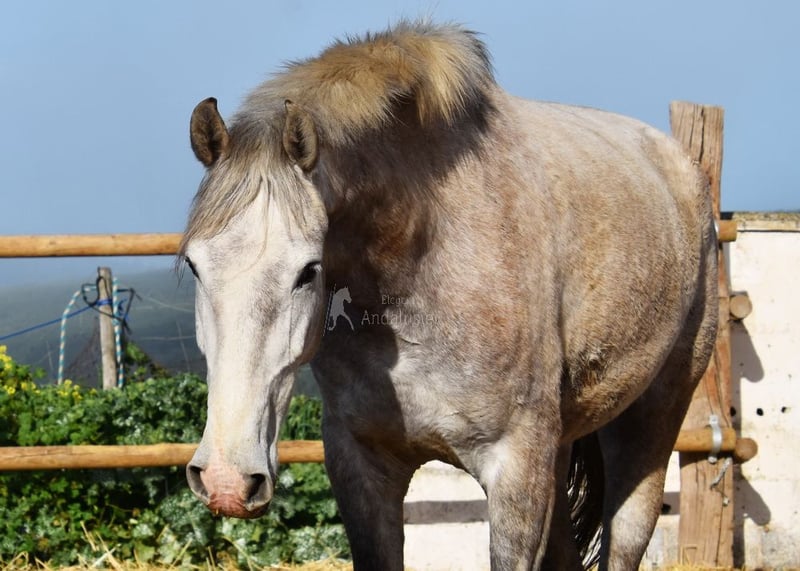 lieber Charakter, neugierig, menschenbezogen, roh, longiert, steht mit anderen Stuten draußen, groß, gute Bewegungen und Abstammung, Abstammung: Plaza de Armas, Yeguada Militar, Yeguada Vilaire, Opa Judio VII ist qualifiziert www.elegante-andalusier.com