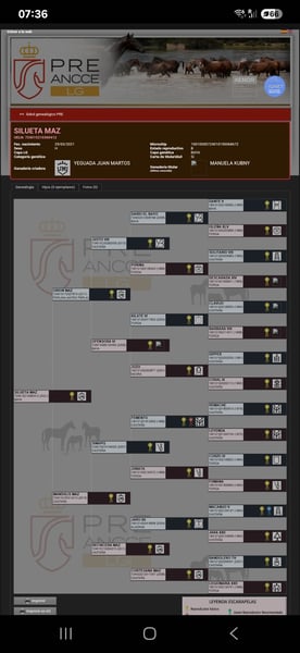 Silueta MAZ z ogierkiem Lozano Kubny przy nodze, w kolorze palomino, urodzonym 29.04.2025. Otrzyma pełne papiery ANCCE, jego ojcem jest Silenzio MAZ. Silueta MAZ jest ogierem, który został ogłoszony i jest w treningu, urodziła się 29.03.2021. Posiada trzy bardzo dobre GGA do wykazania. Jej wzrost wynosi 170 cm. Pochodzi z hodowli Junan Martos, hodowli PRE, specjalizującej się w nietypowych kolorach do sportu ujeżdżeniowego. Jest znana z bardzo wysokiej jakości koni, które są silne, barokowe i dużego wzrostu. Wszystkie konie z tej hodowli mają dobry, zrównoważony i jasny charakter. Obie linie rodzicielskie Siluety pochodzą z linii Escalera i Yeguada Militar, a ze strony ojca znajduje się ogier Paco Marti, który również jest bardzo znanym hodowcą PRE, specjalizującym się w nietypowych kolorach o bardzo wysokiej jakości i mechanice chodu do sportu ujeżdżeniowego. Silueta MAZ została ogłoszona w 2024 roku przez ANCCE, jest klaczą bayo, a jej kod genetyczny to gg Aa Ee CCr NN. Matka: Mandulis MAZ, Ojciec: Orión MAZ