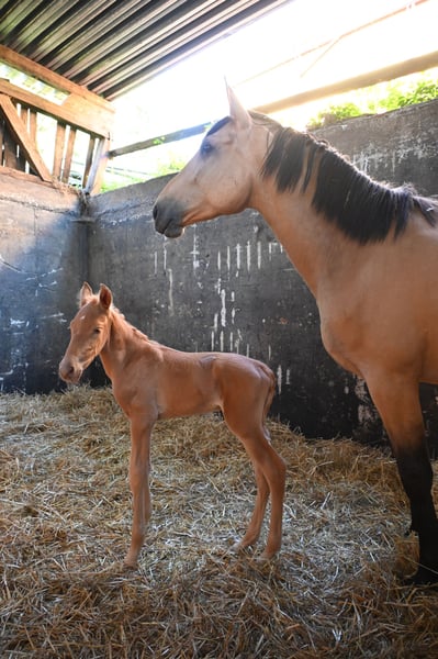 Silueta MAZ with colt Lozano Kubny at foot, in the color Palomino, born on April 29, 2025. He will receive full ANCCE papers, his father is Silenzio MAZ. Silueta MAZ is approved and backed, she is a PRE mare born on March 29, 2021. She has three very good gaits to show. Her height is 170 cm. She comes from the breeding of Junan Martos, a breeding of PREs specializing in special colors for dressage. He is known for a very high quality of horses that are strong, baroque in style, and large in stature. All horses from this breeding have a good, balanced, and clear character. Both sides of Silueta's pedigree trace back to Escalera lines and Yegada Militar, with a stallion from Paco Marti on the paternal side, who is also a very well-known PRE breeder specializing in special colors with very high quality and a gait mechanics suitable for dressage. Silueta MAZ was approved by ANCCE in 2024, she is a Bayo mare, the genetic code is gg Aa Ee CCr NN. Mother: Mandulis MAZ, Father: Orión MAZ