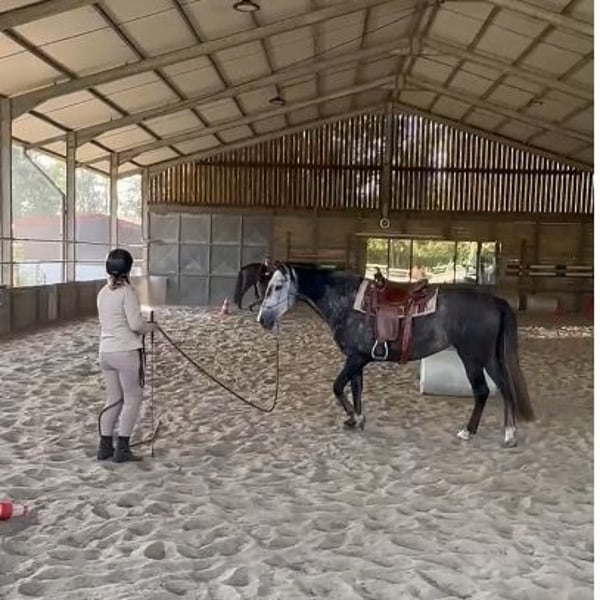 Sol (Wenne WH) ist eine 6-jährige PRE-Schimmelstute von ca. 1,55 m, derzeit in professioneller Parelli-Ausbildung bei Fien De Baere (Pony Connect - Deinze). Horsenality: LBE. Sie lernt schnell, denkt mit und bleibt emotional verfügbar.