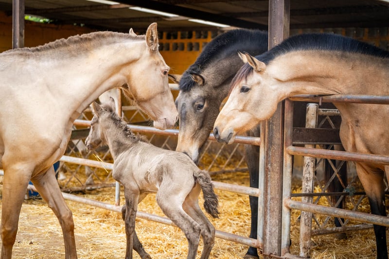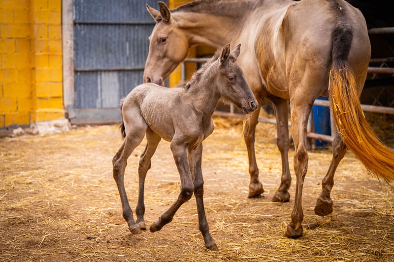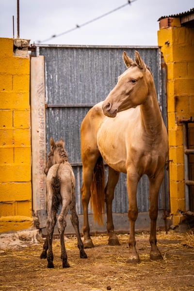 Breeding: Young 3 year old breeder with her first foal at foot ( stallion ). This time we have only taken a few good photos so that the mare does not have any stress with her foal, which is only a few hours old! The price is for the mare with foal. Her color genetics are: ggaaEEPRLPRL. She carries Peralta, Yeguada Militar and Bohorquez blood in her abandonment. The foal is also champagne and has typical characteristics of a Grullo ( fertiliser ). / More information on request!